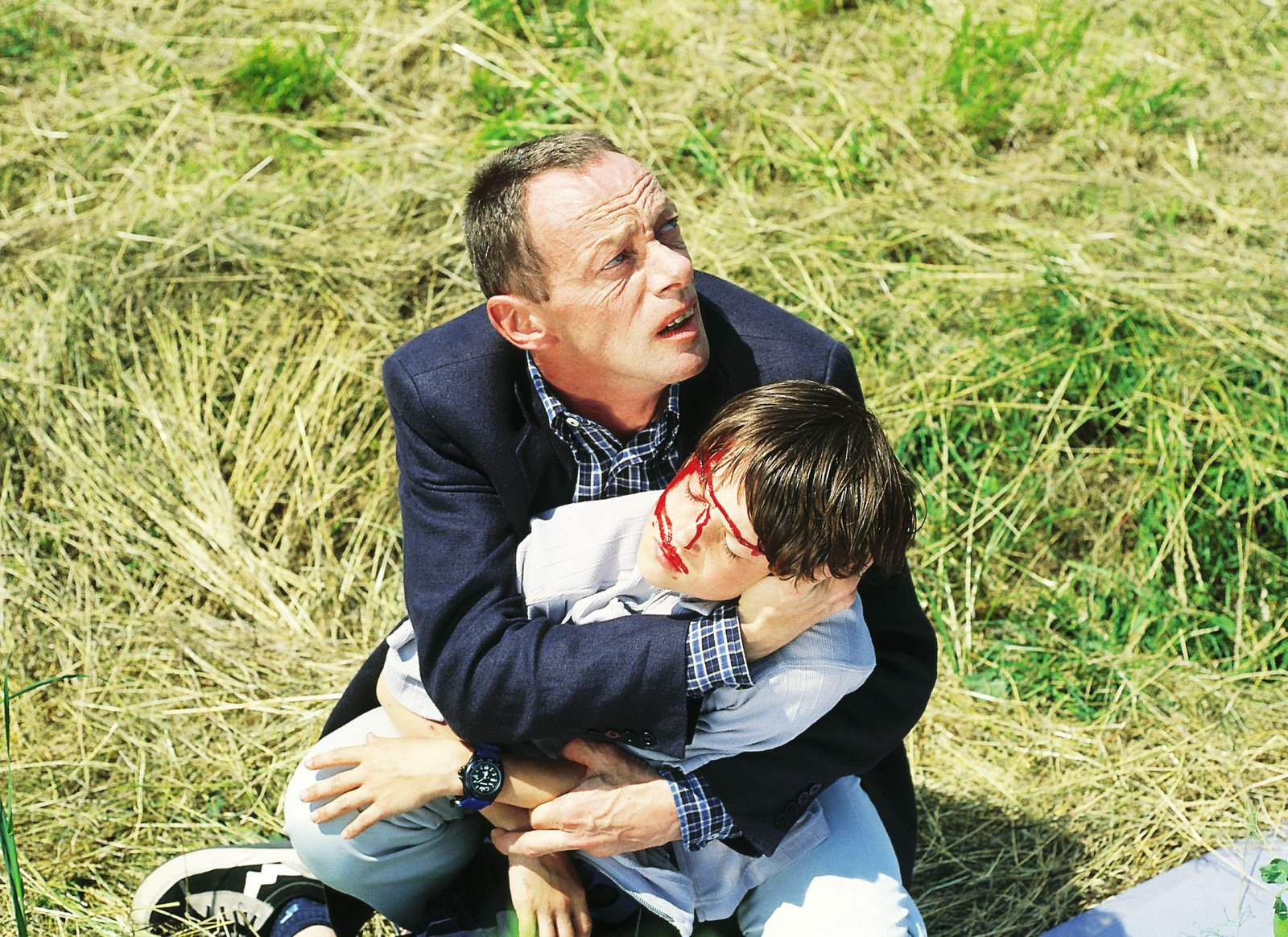 Das kalte HerzPaul Dorsch (Erwin Leder) hält seinen schwer verletzten Sohn Marc (Marco von Mackensen) in den Armen.Bild: © RTLplus / Helene Waldner