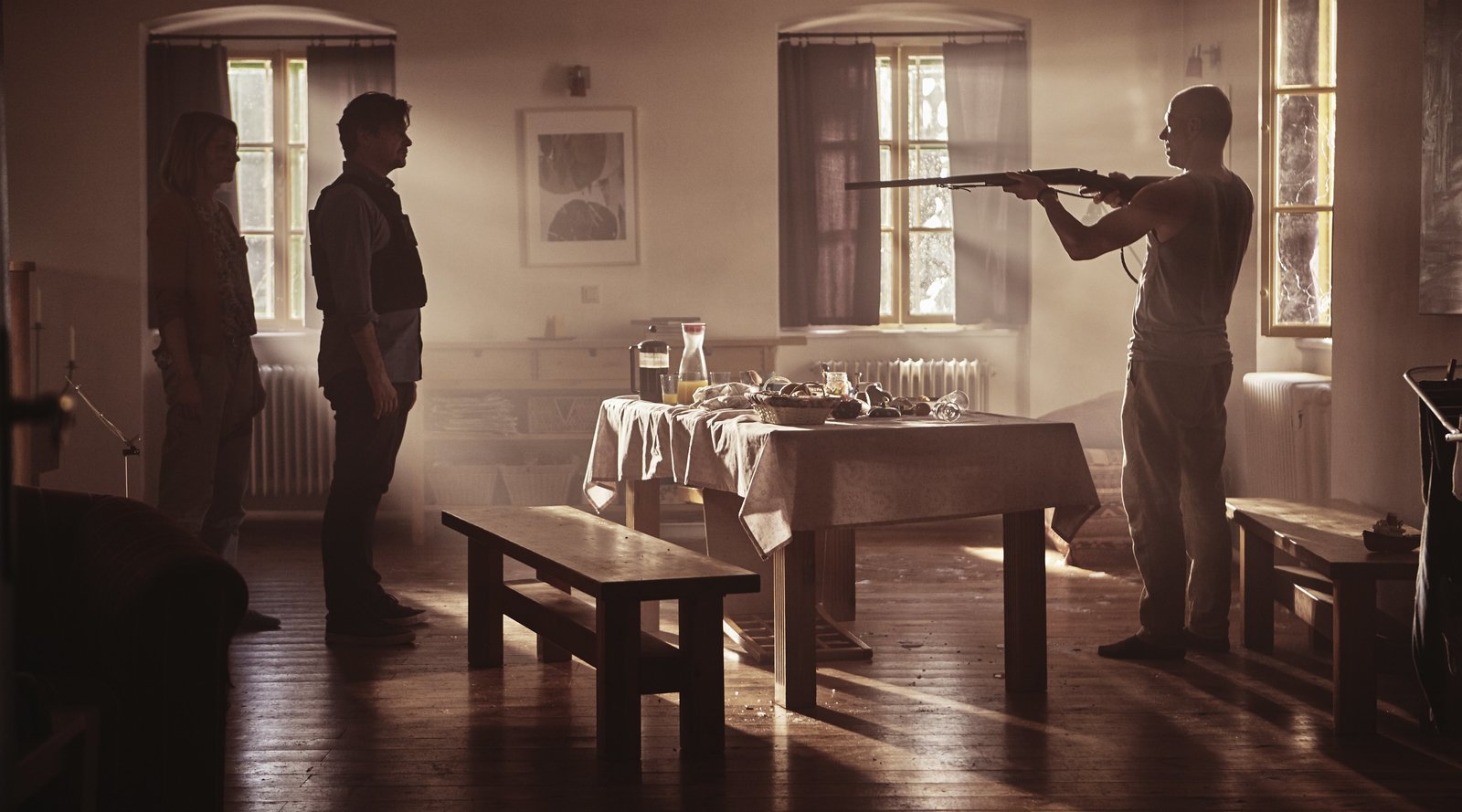 AusweglosWas bringt einen nach außen hin unauffälligen Familienvater dazu, seine eigene Familie als Geiseln zu nehmen? Im Bild, 2.v.l. Thomas Meiberger (Fritz Karl).Bild: © ServusTV / MonaFilm