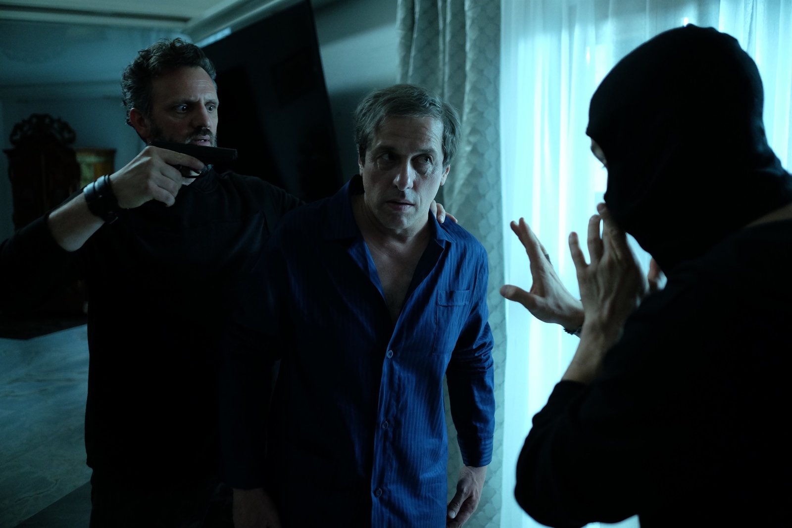 Die StimmenMeiberger (Fritz Karl) wird von Stefan mit einem Messer bedrohtBild: © ServusTV / MonaFilm / Kerstin Stelter