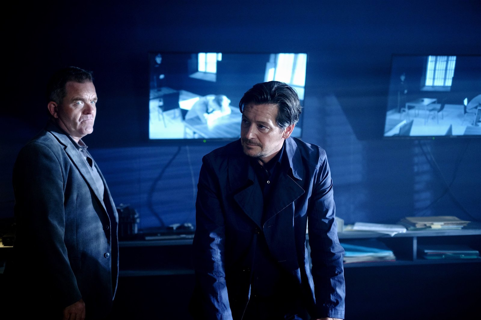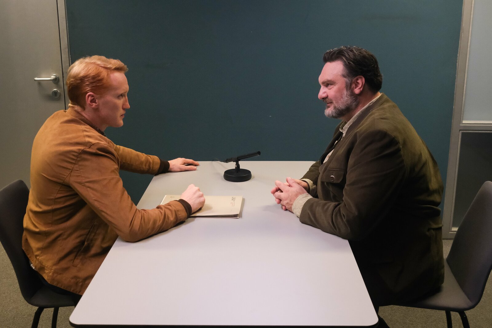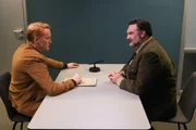 Die dunkle SeiteNepo Wallner (Cornelius Obonya) und Thomas Meiberger (Fritz Karl) besprechen die weitere Vorgehensweise im Verhör.Bild: © ServusTV / MonaFilm / Philipp Broszek