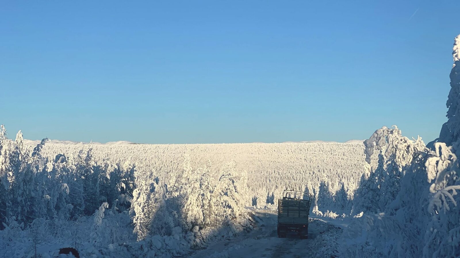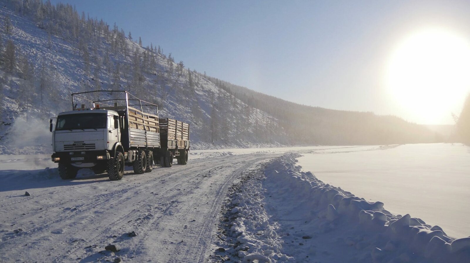Russland - Die Eistrucker von JakutienDer LKW von Alban Modun auf dem zugefrorenen Fluss Tompo. 25 Tonnen Mehl hat Modun geladen - fünf mehr als offiziell erlaubt.Bild: © ZDF und WDR.