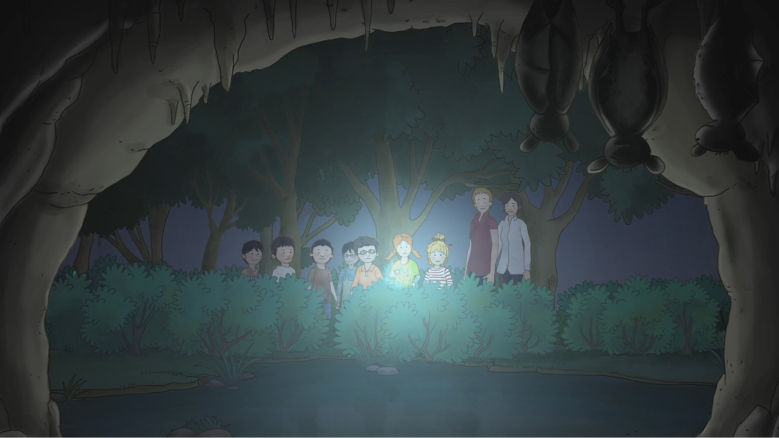 Conni lernt backenConni und ihre Freunde Simon und Anna halten den Atem an, als sie bei der Nachtwanderung mit ihrer Kindergartengruppe Fledermäuse in einer Höhle entdecken.Bild: © ZDF/Henning Windelband/Youngfilms GmbH