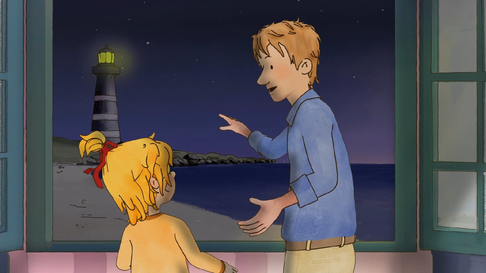 Conni am StrandWarum ein Leuchtturm leuchtet, und was Ebbe und Flut ist, erklärt Papa ganz geduldig seiner neugierigen Conni.ÂBild: © ZDF und Henning Windelband
