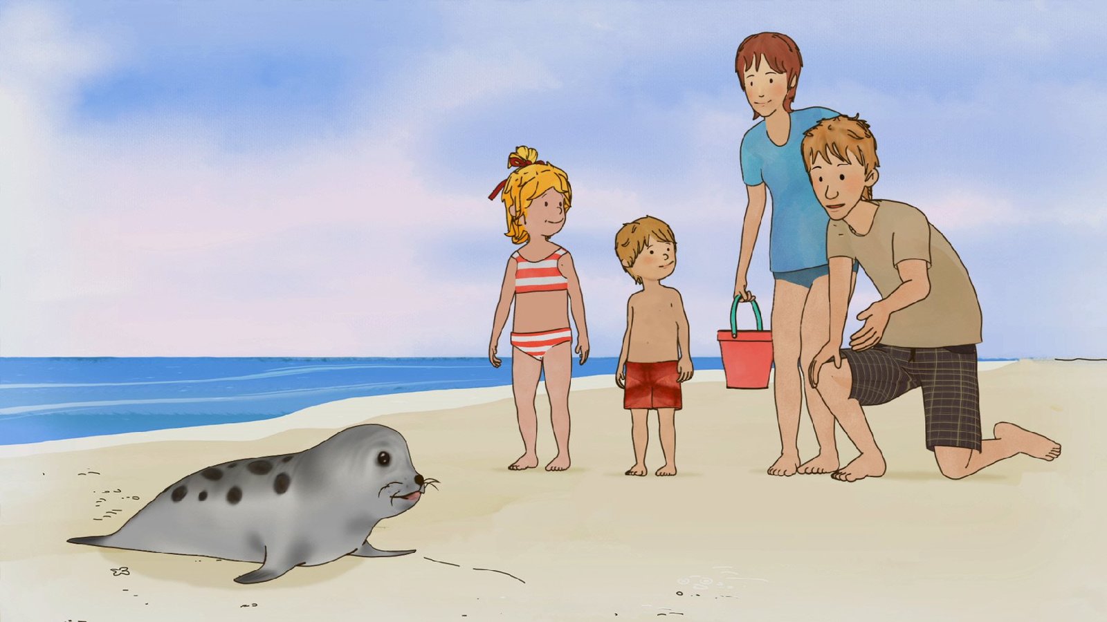 Conni am StrandConni ist entzückt- ein Seehundbaby! Aber Papa weiß, dass der kleine Heuler Hilfe braucht und in die Seehund-Aufzuchtstation muss.Bild: © ZDF/Henning Windelband/Youngfilms GmbH