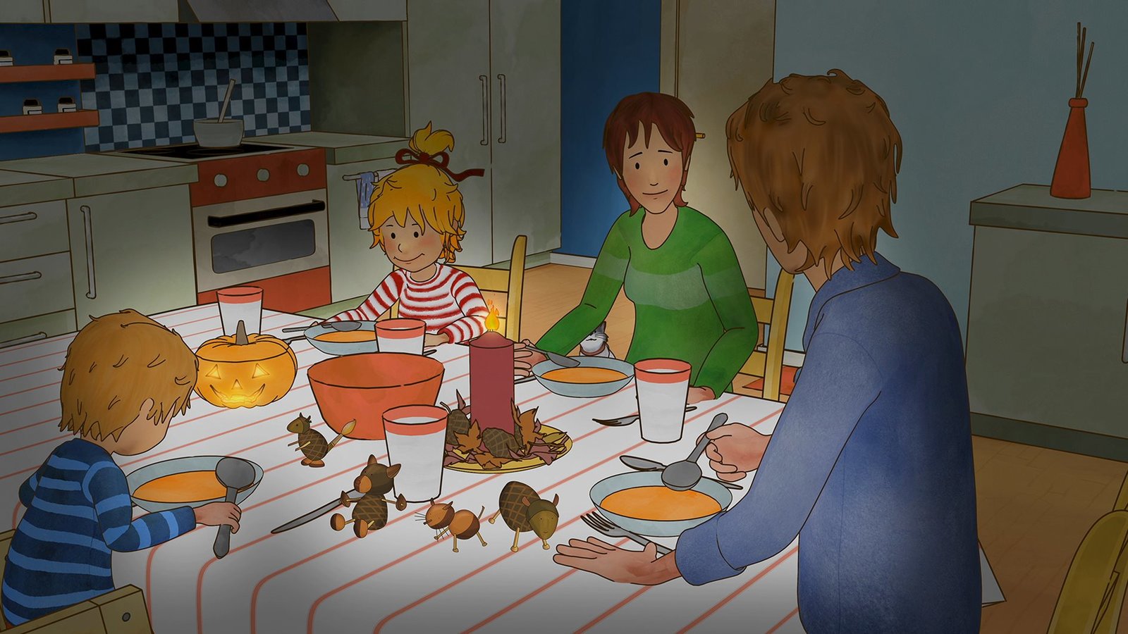 Conni sucht Kater MauDer Tisch von Familie Klawitter ist mit Selbstgebastelten herbstlich geschm??ckt.Bild: © ZDF/Henning Windelband/Youngfilms GmbH