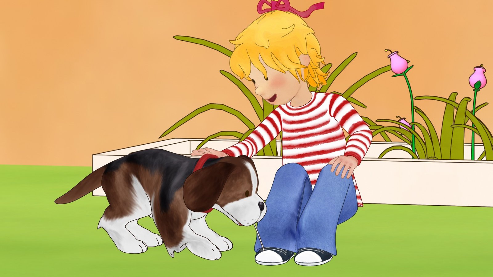 Conni und der HundebesuchHündin Polly ist ganz brav und lässt sich geduldig von Conni streicheln.ÂBild: © ZDF/Henning Windelband/Youngfilms GmbH