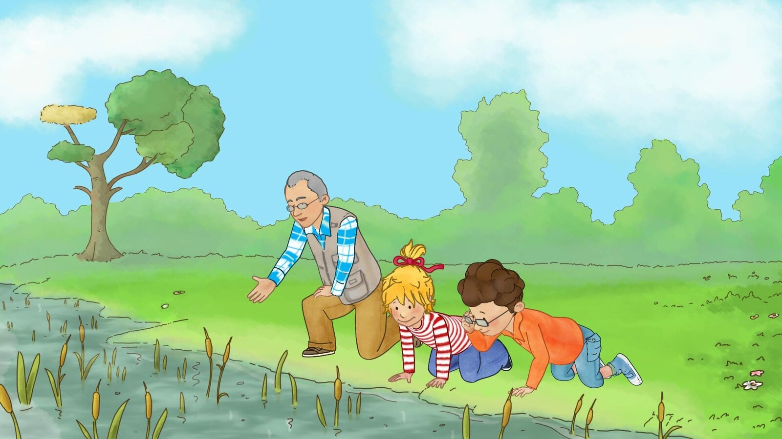 Conni und das FroschkonzertOpa zeigt Conni und Simon, wo sie Kaulquappen finden können.Bild: © ZDF/Henning Windelband/Youngfilms GmbH