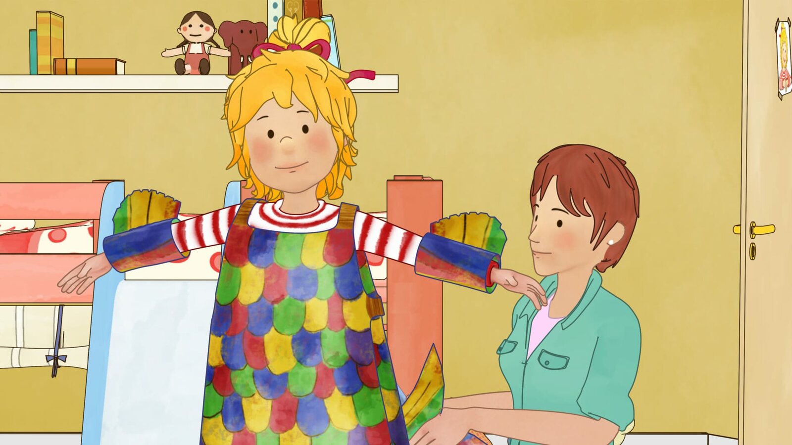 Conni spielt TheaterConni probiert Regenbogenfisch-Kostüm an.Bild: © ZDF/Henning Windelband/Youngfilms GmbH