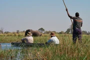Ankunft im DeltaLevison Wood and Kane Motswana watch elephants in the water of the Okavango DeltaBild: © Animal Planet / Discovery Communications, LLC