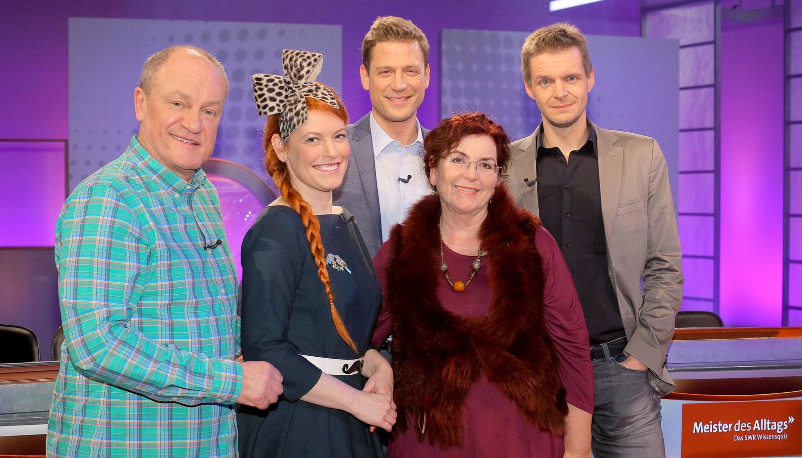 Folge 85SWR Fernsehen "MEISTER DES ALLTAGS - DAS SWR WISSENSQUIZ", am Montag (08.06.15) um 22:30 Uhr. Moderator Florian Weber stellt in seinem SWR Wissensquiz ?Meister des Alltags? die Alltagstauglichkeit seiner prominenten Kandidaten auf die Probe. ?Meister des Alltags? spendet seinen Gewinn einem guten Zweck. v.li.: Enie van de Meiklokjes, Bodo Bach, Florian Weber, Alice Hoffmann und Guido Cantz.Bild: © SWR/Peter A. Schmidt