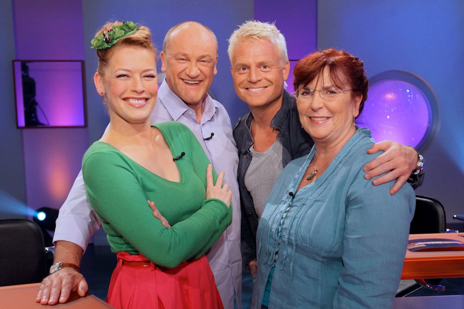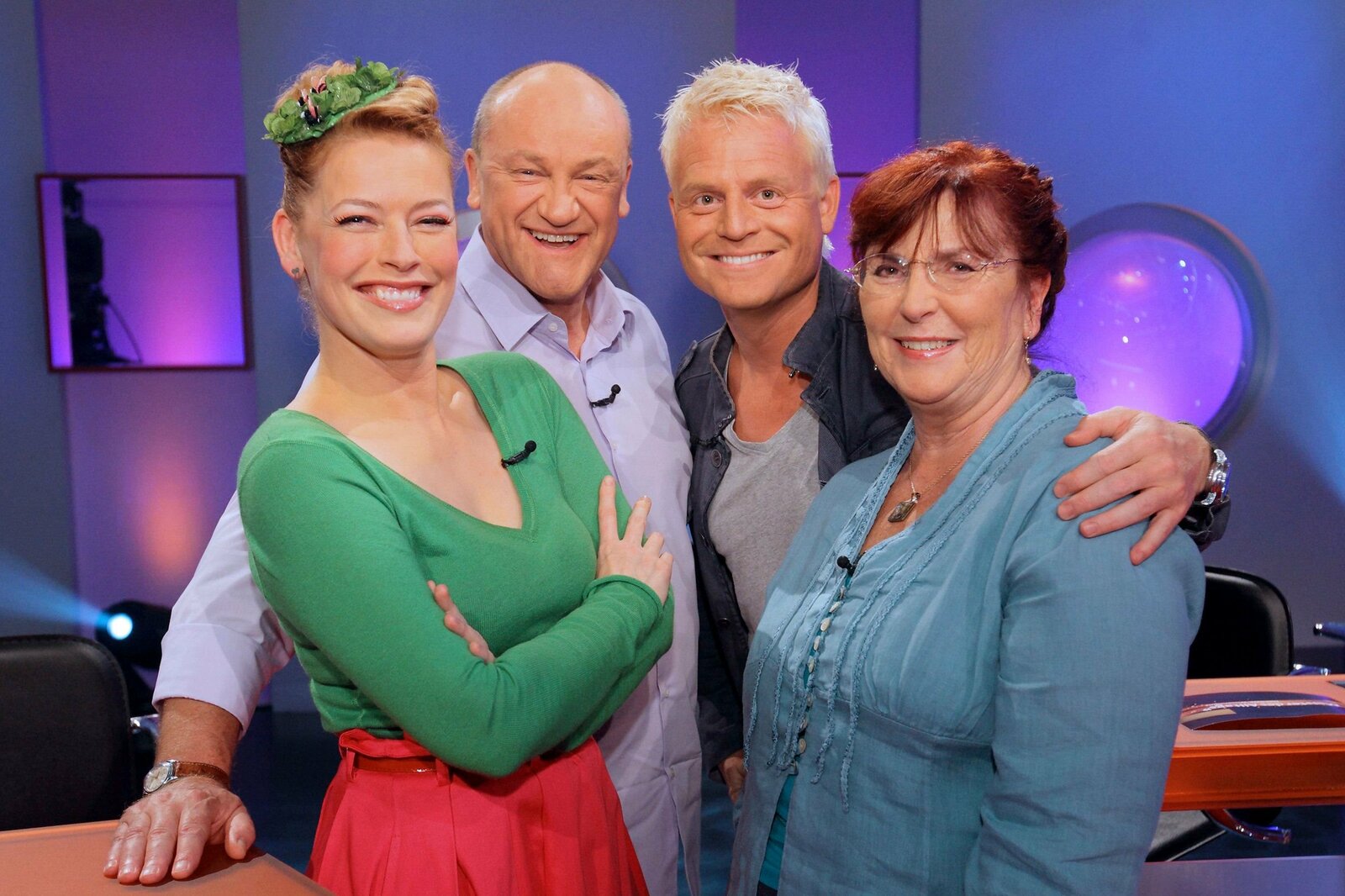 Folge 38SWR Fernsehen "MEISTER DES ALLTAGS - DAS SWR WISSENSQUIZ", am Montag (20.01.14) um 22:30 Uhr. v.li.: Enie van de Meiklokjes, Bodo Bach, Guido Cantz und Alice Hoffmann.Bild: © SWR/Peter A. Schmidt