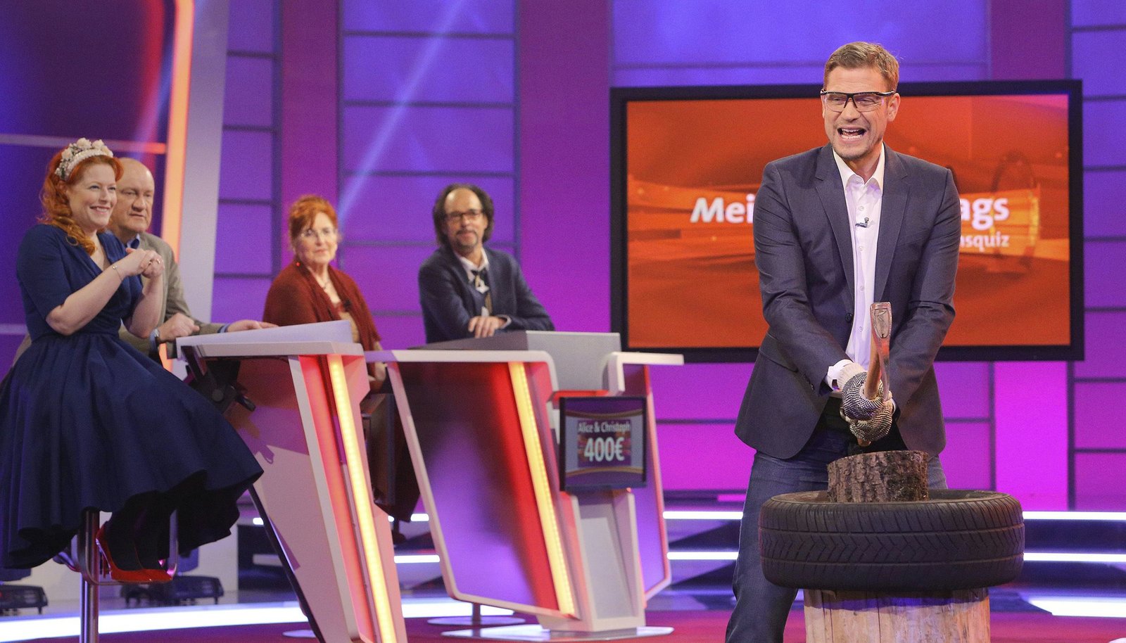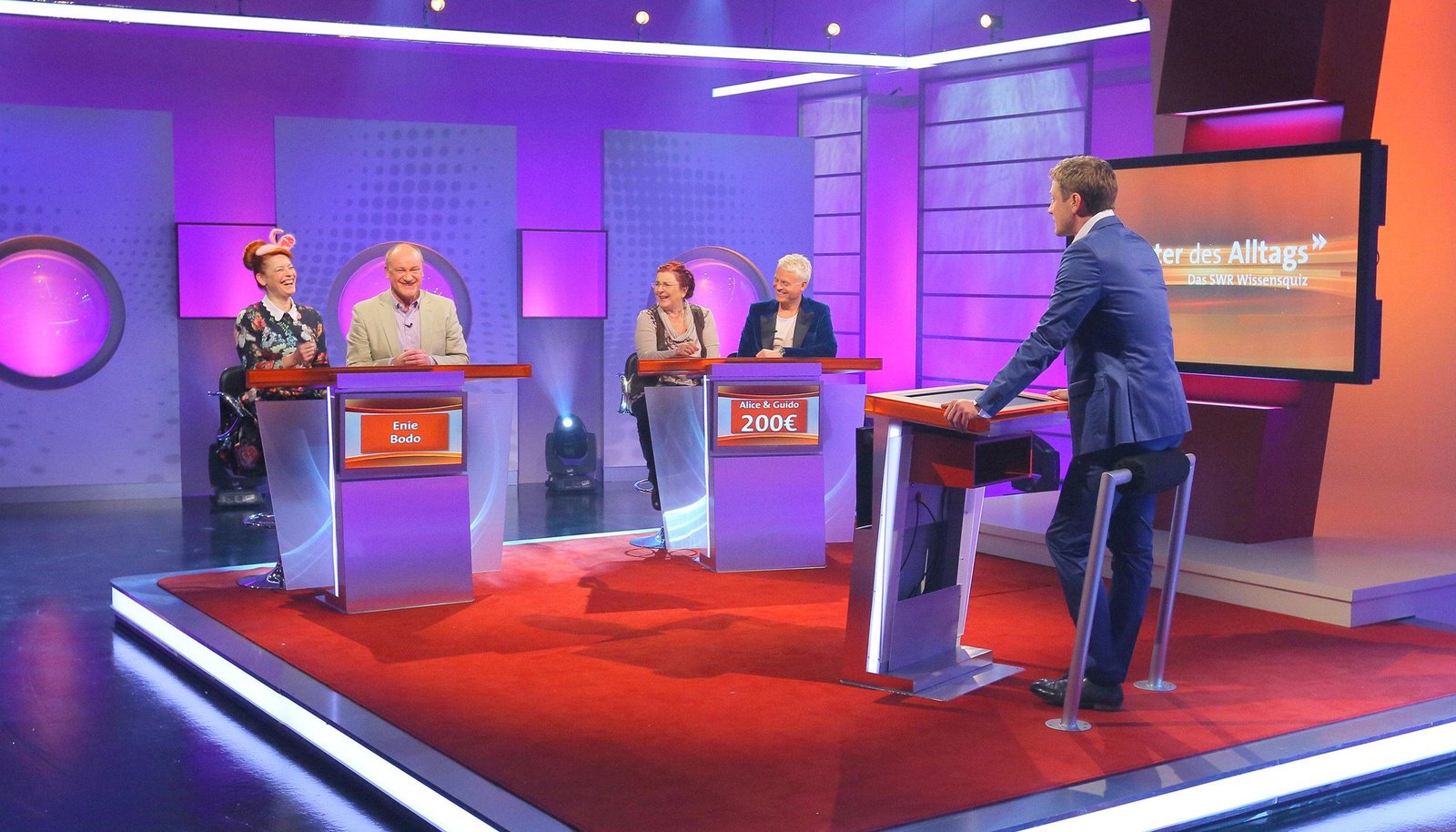 Folge 124Moderator Florian Weber (re.) stellt in seinem SWR Wissensquiz ?Meister des Alltags? die Alltagstauglichkeit seiner prominenten Kandidaten auf die Probe. ?Meister des Alltags? spendet seinen Gewinn einem guten Zweck. v.li.: Enie van de Meiklokjes, Bodo Bach, Alice Hoffmann und Florian Schroeder.Bild: © SWR/Peter A. Schmidt