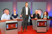 Folge 42SWR Fernsehen "MEISTER DES ALLTAGS - DAS SWR WISSENSQUIZ", am Montag (30.03.15) um 22:55 Uhr. v.li.: Bodo Bach, Enie van de Meiklokjes, Florian Weber, Guido Cantz und Alice Hoffmann.Bild: © SWR/Peter A. Schmidt
