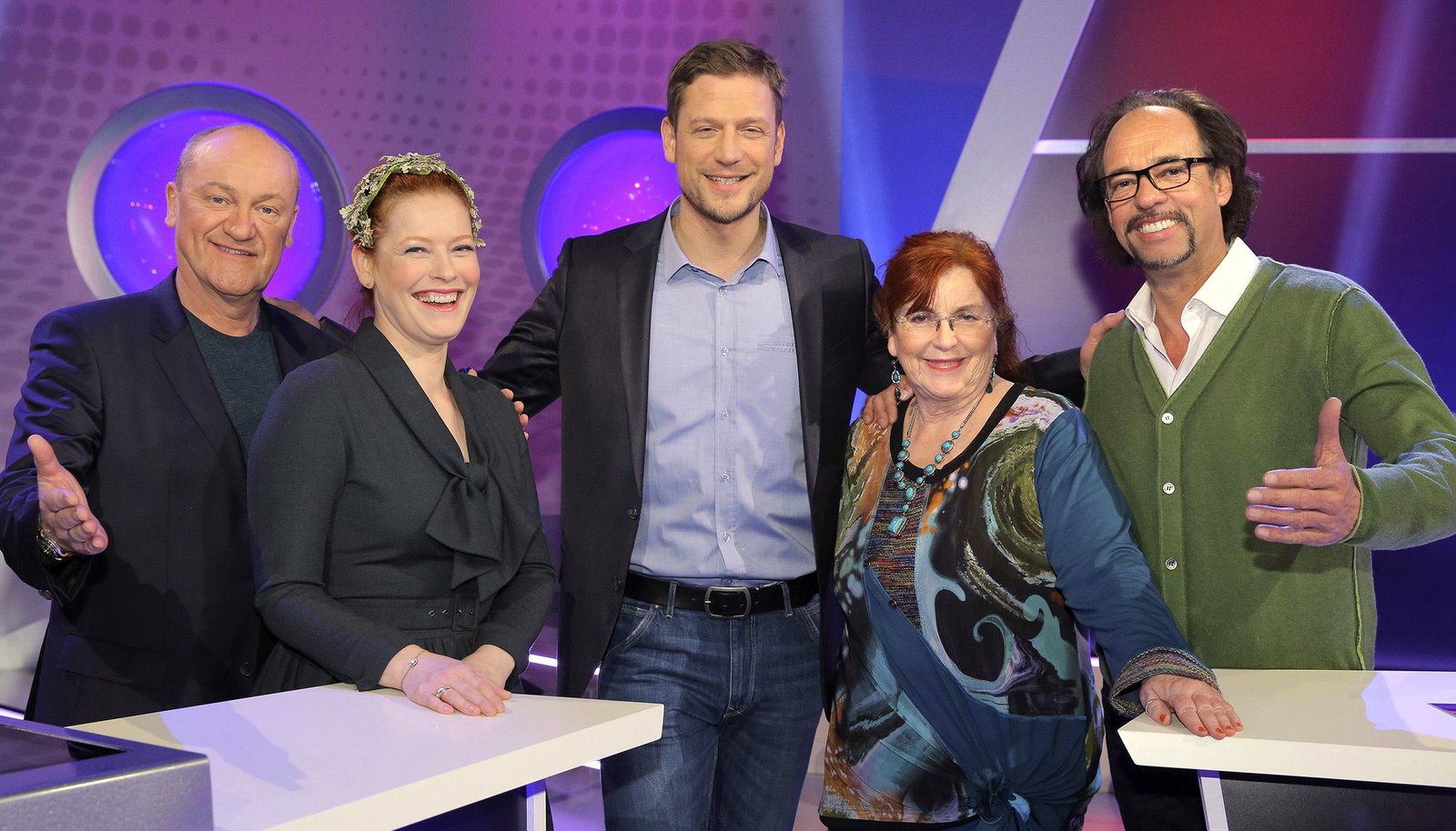 Folge 56v.li. mit Bodo Bach, Enie van de Meiklokjes, Florian Weber, Alice Hoffmann und Florian Schroeder.Bild: © SWR/Peter A. Schmidt
