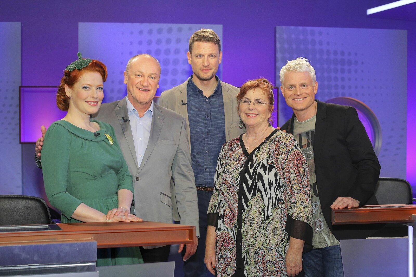 Folge 44SWR Fernsehen "MEISTER DES ALLTAGS - DAS SWR WISSENSQUIZ", am Montag (06.10.14) um 23:45 Uhr. Wann darf man den Rasen mähen? Wann das Auto waschen? Wie viel Schlaf braucht der Mensch, um fit zu sein, und wo stecken die geheimen Stromfresser im Haus? Moderator Florian Weber stellt in seinem SWR Wissensquiz „Meister des Alltags“ die Alltagstauglichkeit seiner prominenten Kandidaten auf die Probe. „Meister des Alltags“ spendet seinen Gewinn einem guten Zweck, jeweils montags um 22.30 Uhr im SWR Fernsehen. v.li.: Enie van de Meiklokjes, Bodo Bach, Alice Hoffmann, Guido Cantz und Florian Weber.Bild: © SWR/Peter A. Schmidt