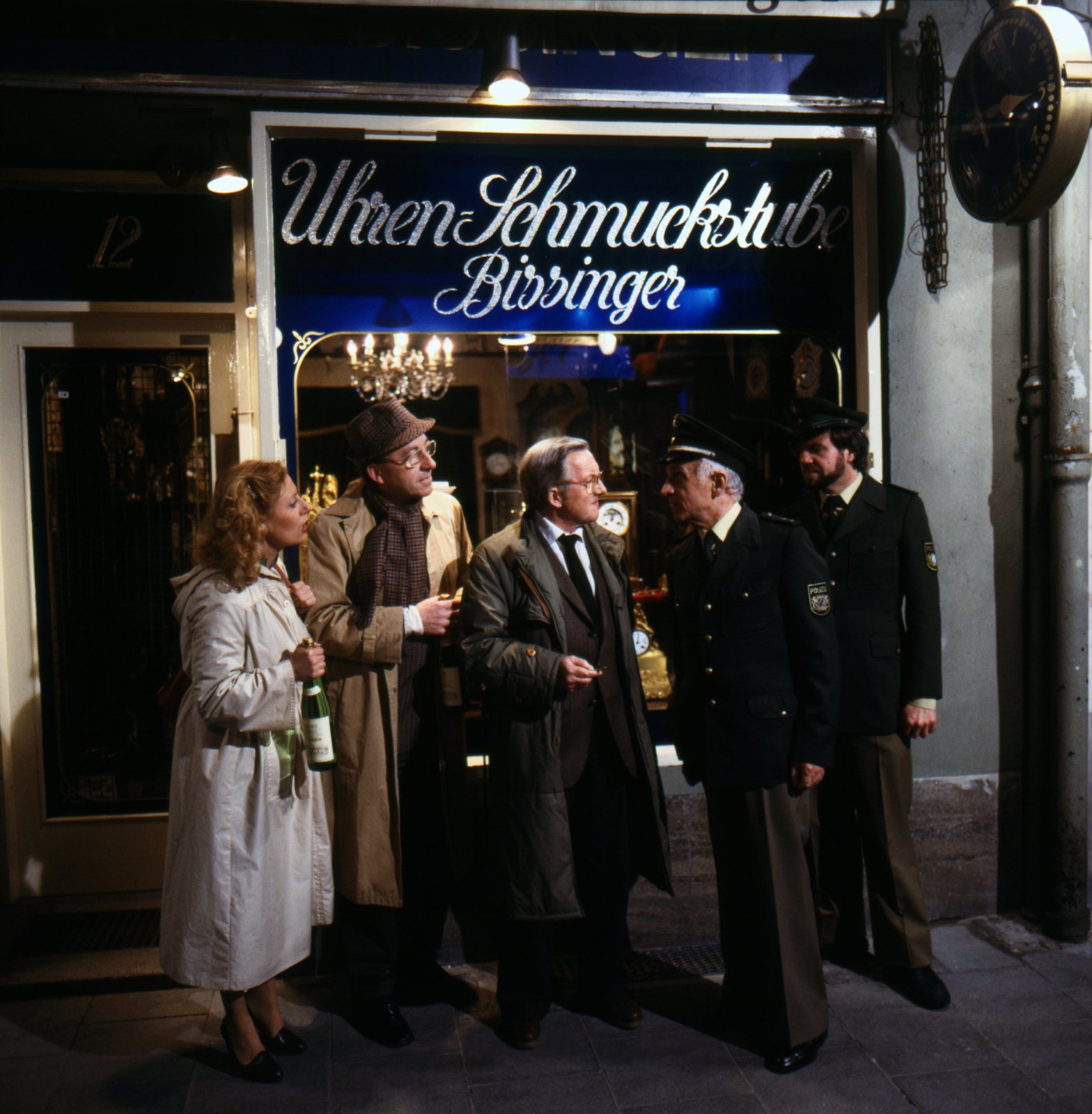 Pumuckl will eine Uhr habenEine ganze Nacht im Uhrengeschäft? Pumuckl interessiert sich neuerdings für Uhren. Er reißt aus und schleicht sich in einen Uhrenladen. Dort ist er fasziniert von den kleinen Tanzfiguren einer Spieluhr. In seiner Begeisterung merkt er nicht, dass der Besitzer des Ladens Feierabend macht und die Tür absperrt. Pumuckl ruft um Hilfe, bis Passanten die Polizei alarmieren. Von links: Hildegard (Veronika Faber), Willibald (Gert Burkhard), Uhrmacher Meisel (Hans Jürgen Diedrich) und zwei Polizisten (Alexander Malachovsky, Wolfgang Klein).Bild: © BR/Infafilm GmbH