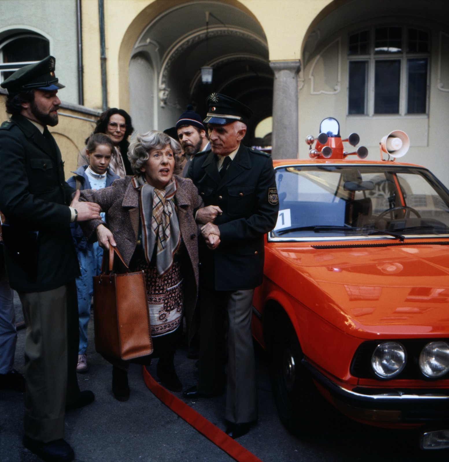 Das Spiel mit dem FeuerUngehorsam muss bestraft werden. Pumuckl bedrängt Meister Eder, ihm Streichhölzer zum Spielen zu geben, denn das Feuer im Werkstattofen hat ihn fasziniert. Eder erklärt ihm, welche Folgen Unachtsamkeit im Umgang mit Streichhölzern haben kann. Als Eder zu einem Kunden gerufen wird, entdeckt Pumuckl in der Küche Zünd- hölzer. Ein verhängnisvoller Fund... Von links: ein Polizist (Wolfgang Klein), Charlotte (Kerstin Pöppelmann), eine Frau (Hannelore Doerr), Frau Eichinger (Erni Singerl), Hausmeister Stürzlinger (Werner Zeussel) und ein Polizist (Alexander Malachovsky).Bild: © BR/Infafilm GmbH