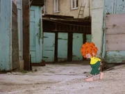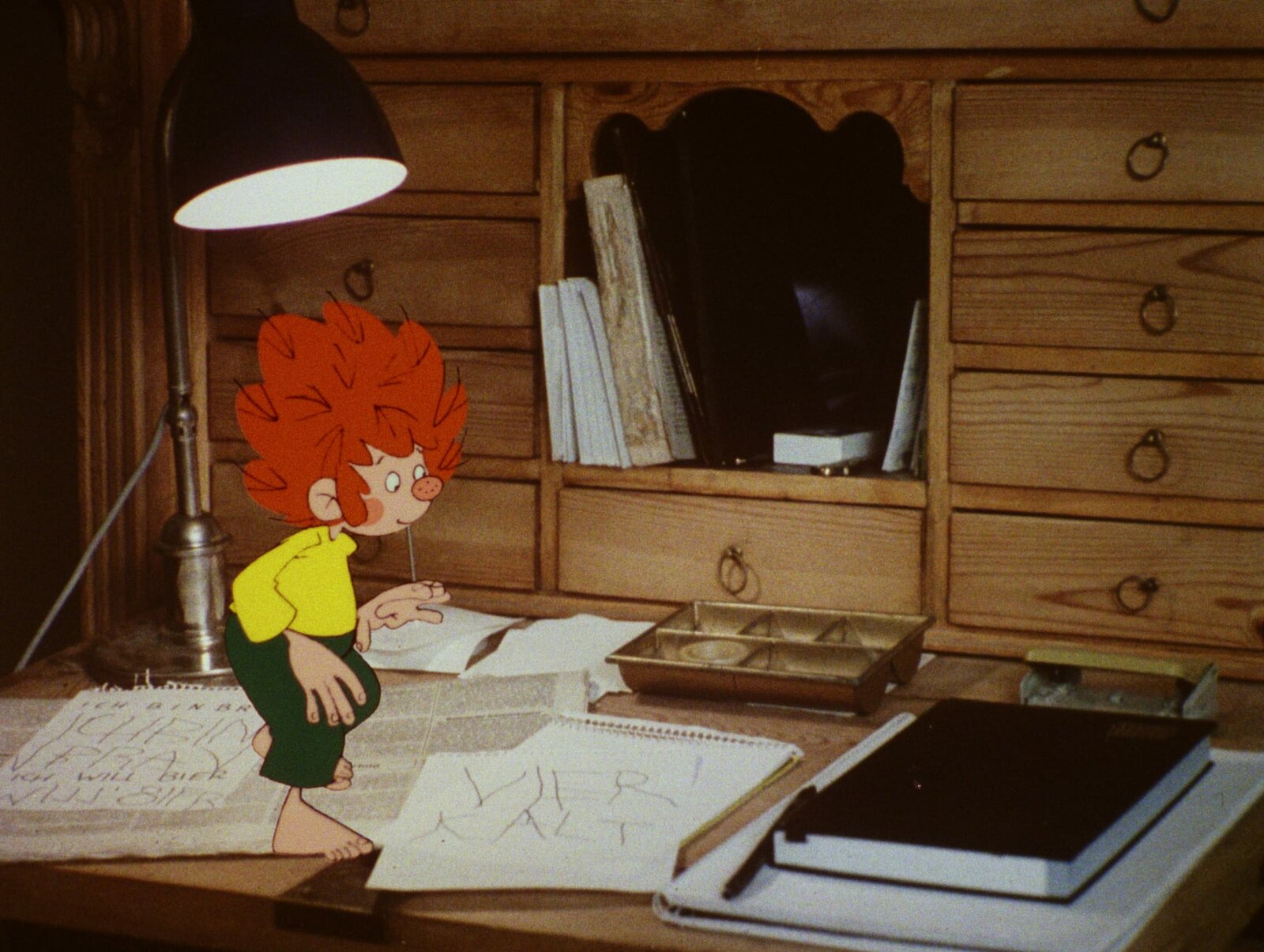 Die geheimnisvollen BriefePumuckl schreibt einen Brief an die Hausmeisterin. "Vier kalt" steht darin. Die Hausmeisterin wundert sich sehr und denkt bald, dass ein gefährlicher Verrückter sie bedrohen will.Bild: © BR/Infafilm GmbH/Original-Entwurf "Pumuckl"-Figur: Barbara von Johnson