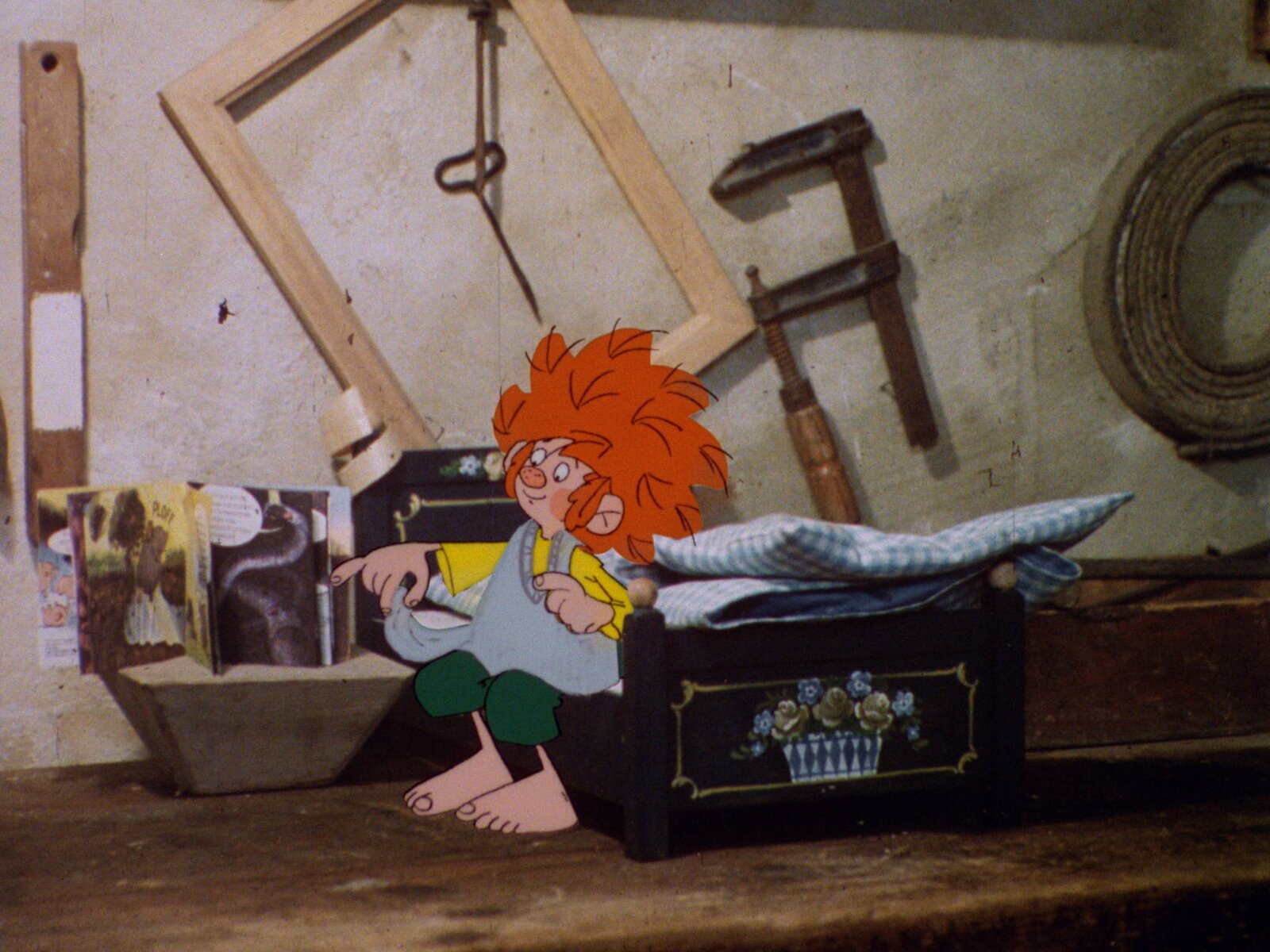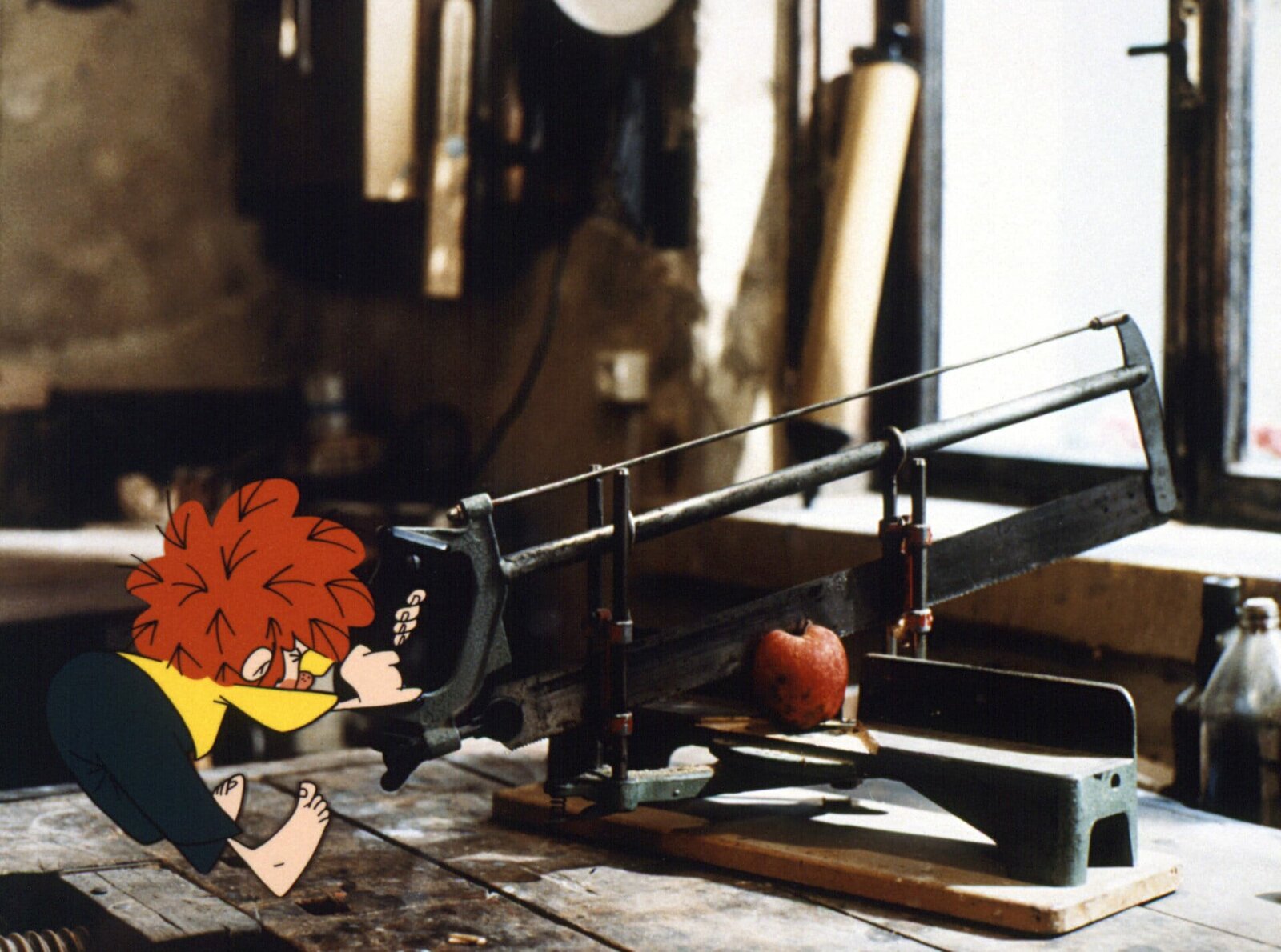 Pumuckl ist an gar nichts schuldMeister Eders Hobelmaschine geht kaputt und Herr Schrader muss kommen, um sie wieder zu richten. Doch der verlegt seinen Schraubenzieher, dort eine Schraube ... Steckt Pumuckl dahinter oder hat er diesmal wirklich nichts mit der Sache zu tun?Bild: © BR/Infafilm GmbH/Original-Entwurf "Pumuckl"-Figur: Barbara von Johnson
