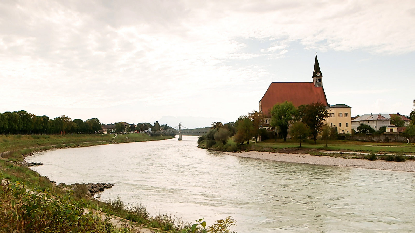 Die ungleichen GeschwisterDeutsch-Österreichische Grenze an der Salzach. Rechts: Kirche von Laufen, links: Oberndorf.Bild: © ORF2