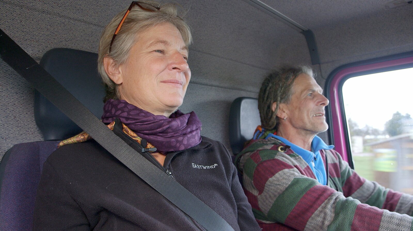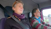 Thomas und Conny im Führerhaus ihres lila Lasters.Bild: © SWR
