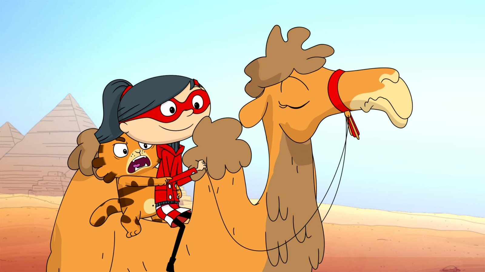 Wer hat Angst vor'm Sonnengott?Die Verfolgungsjagd per Wüstenschiff gefällt Jean Cat nicht.Bild: © WDR/Cyber Group Studios/KD Productions Toons&Games/TelevisiĂł de Catalunya