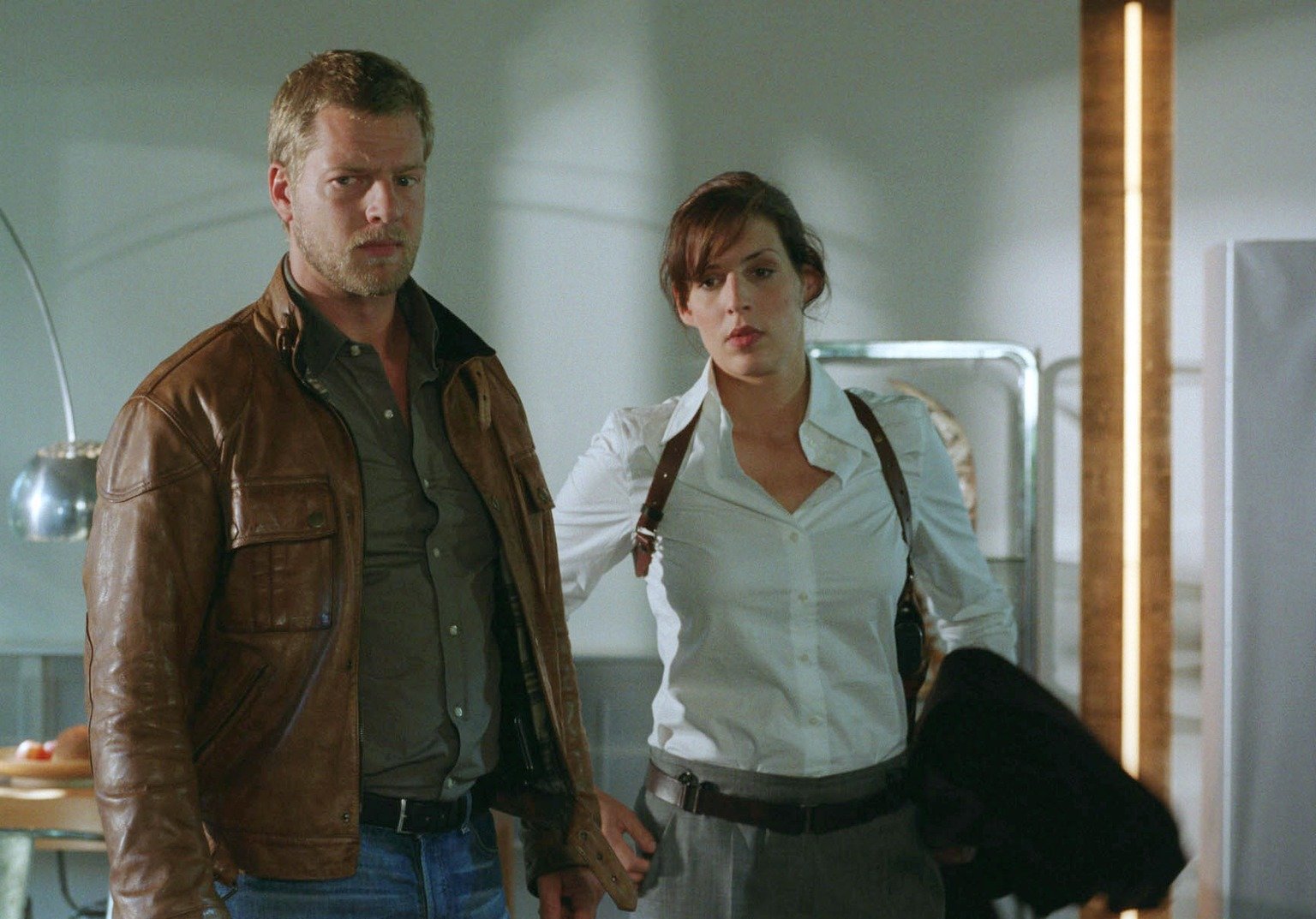 50 Stunden EiszeitPrivatdetektiv Harry Sutor wurde ermordet, als er in das Hotelzimmer des Flugzeugingenieurs Arno Böhm eindrang, um Daten von einem Laptop zu kopieren. Da Böhm selbst unauffindbar ist, vernehmen Nina (Elena Uhlig, M.) und Leo (Henning Baum, l.) Böhms Geschäftspartner Rainer Hayek (Andreas Guenther, r.). Der ist besorgt, da am nächsten Tag die Unterzeichnung eines millionenschweren Vertrages ansteht ...Bild: © SAT.1 / Christian A. Rieger Eigenproduktionsbild frei