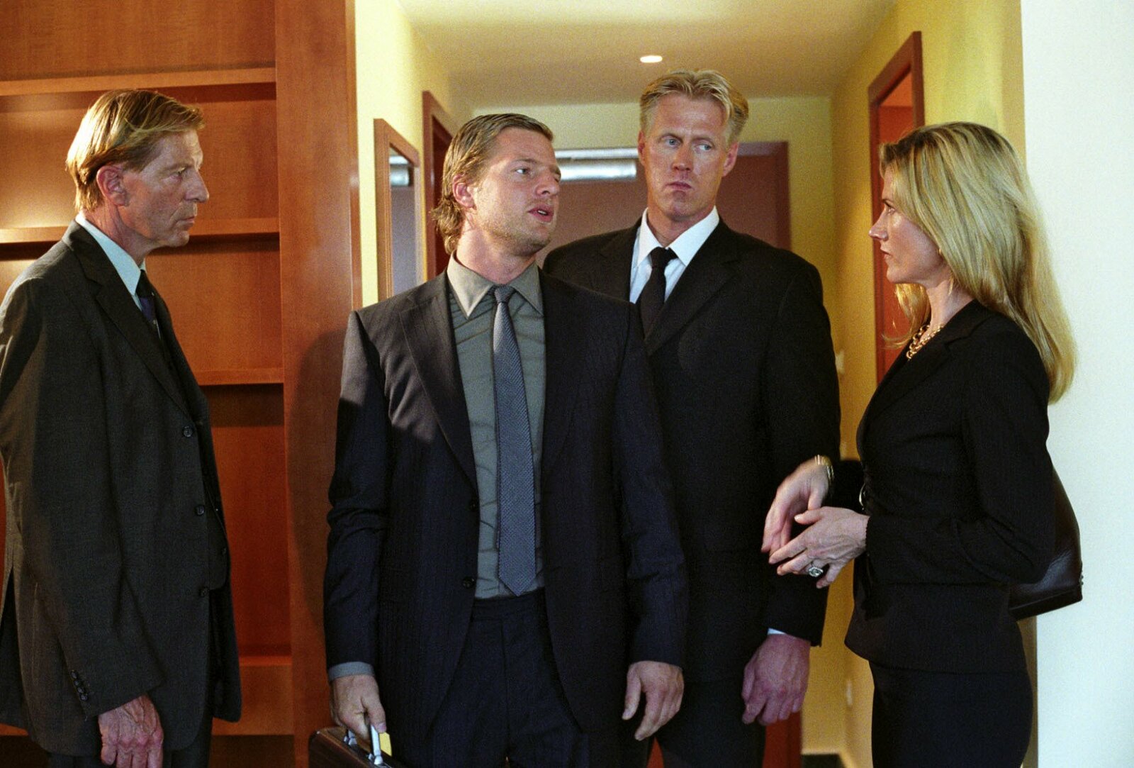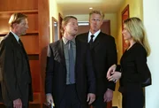 Der KronzeugeMit Giopecci (Dietmar Mössmer, r.) als Kronzeugen meinen Nina (Elena Uhlig, l.) und Leo (Henning Baum, 2.v.r.) einen Trumpf im Ärmel gegen Arno Hauker (Paul Faßnacht, 2.v.l.), einem Drogendealer der ganz üblen Sorte, zu haben. Dumm nur, dass Giopecci und Hauker ausgerechnet im Gerichtsflur aufeinander treffen ...Bild: © SAT.1 / Christian A. Rieger Eigenproduktionsbild frei