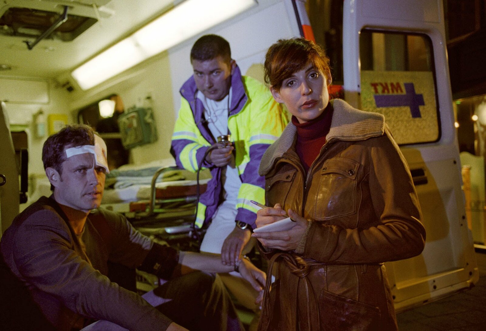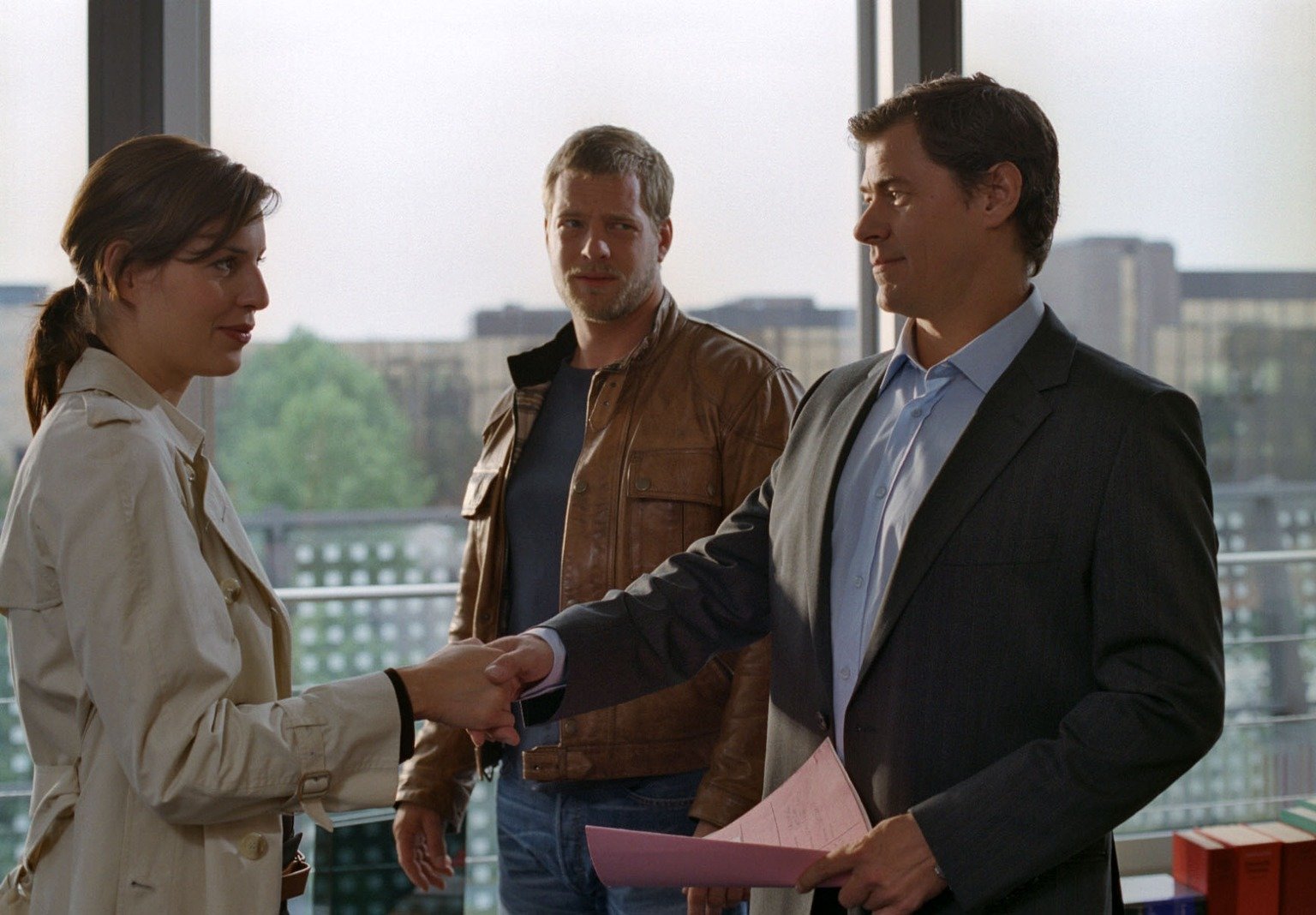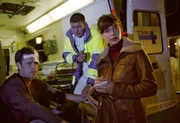AmtsmissbrauchNina (Elena Uhlig, M.) und Leo (Henning Baum, r.) verstehen nicht, warum Andy Breidenbach (Leopold Hornung, l.) das Tagebuch der Toten geklaut hat.Bild: © SAT.1 / Christian A. Rieger Eigenproduktionsbild frei