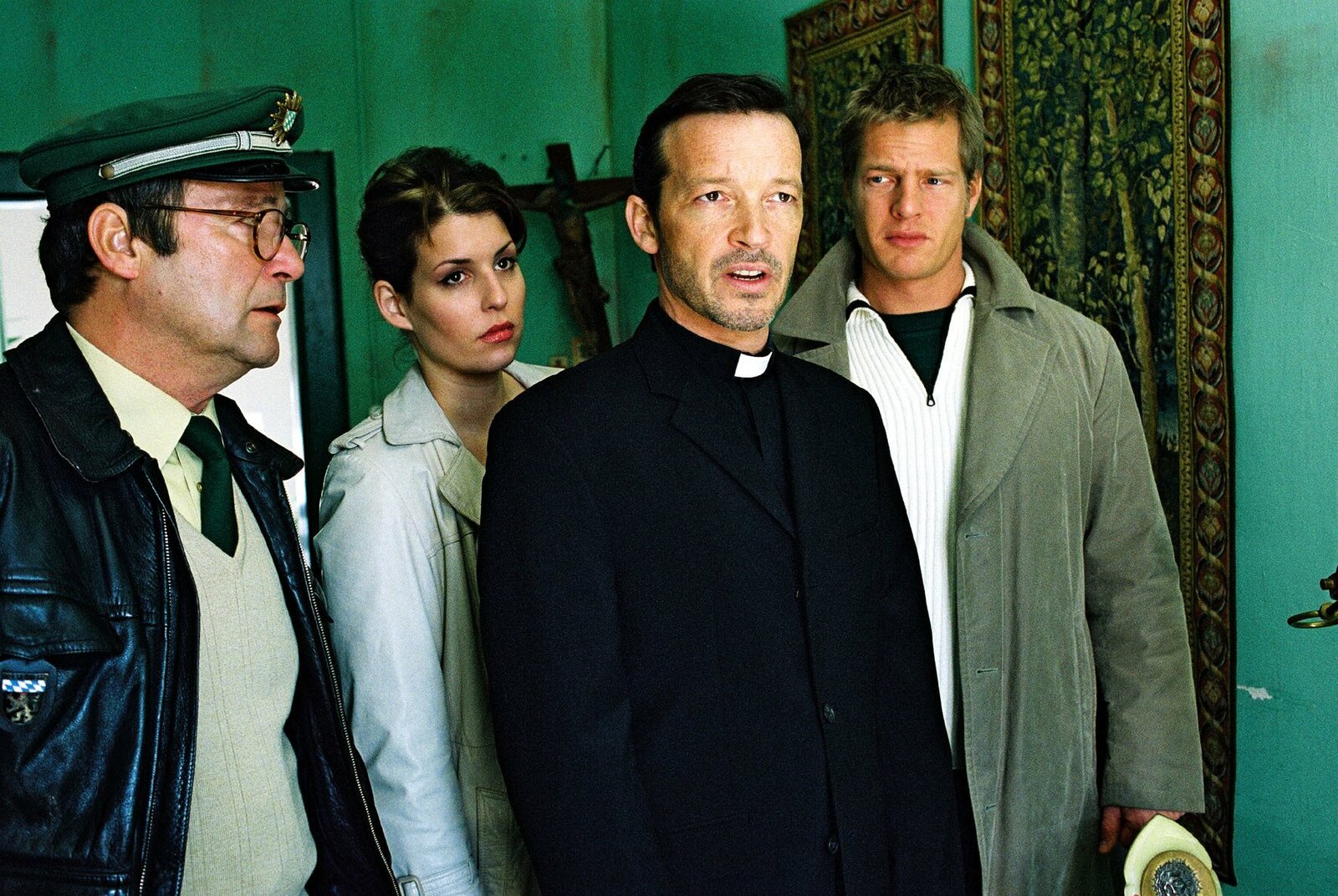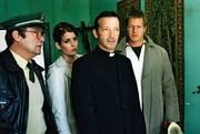AmtsmissbrauchFranz Breidenbach (Erich Hallhuber, l.) nimmt auf Befehl von Leo (Henning Baum, r.) den Priester Johannes Rohner (Michael Roll, 2.v.r.) fest. Nina (Elena Uhlig, 2.v.l.) versteht die Welt nicht mehr ...Bild: © Sat.1 / Christian A. Rieger Eigenproduktionsbild frei