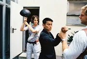 Nasi GorengWan Kwon (Maverick Queck, M.) bedroht Leo (Henning Baum, r.) mit einem Messer. Nina (Elena Uhlig, l.) setzt den Angreifer elegant mit einer Bratpfanne schachmatt ...Bild: © Sat.1 / Christian A. Rieger Eigenproduktionsbild frei