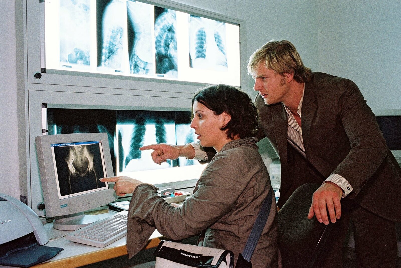 PilotNina (Elena Uhlig, l.) und Leo (Henning Baum, r.) analysieren die Röntgenaufnahmen der Toten.Bild: © SAT.1 / Christian A. Rieger Eigenproduktionsbild frei