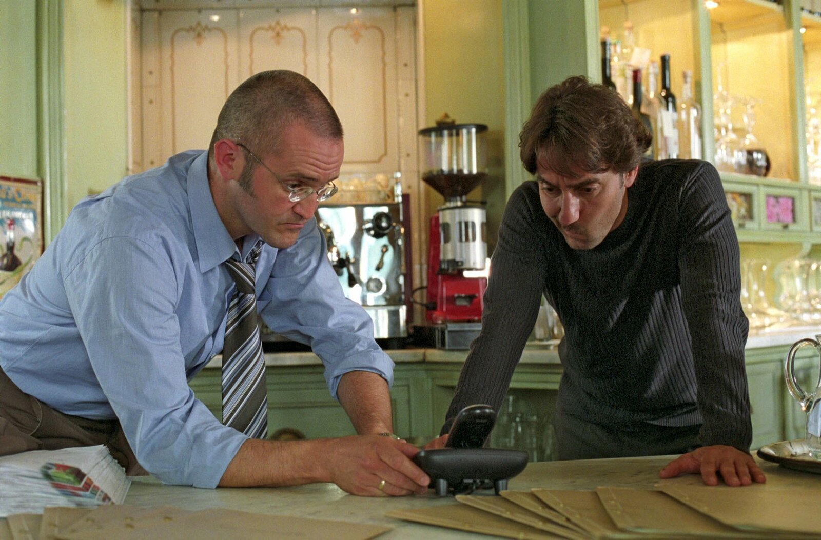 Abgekartetes SpielSchulz (Rainer Haustein, l.) erklärt Francesco (Dieter Landuris, r.) die Fangschaltung, die er in der Osteria installieren musste.Bild: © SAT.1 / Christian A. Rieger Eigenproduktionsbild frei