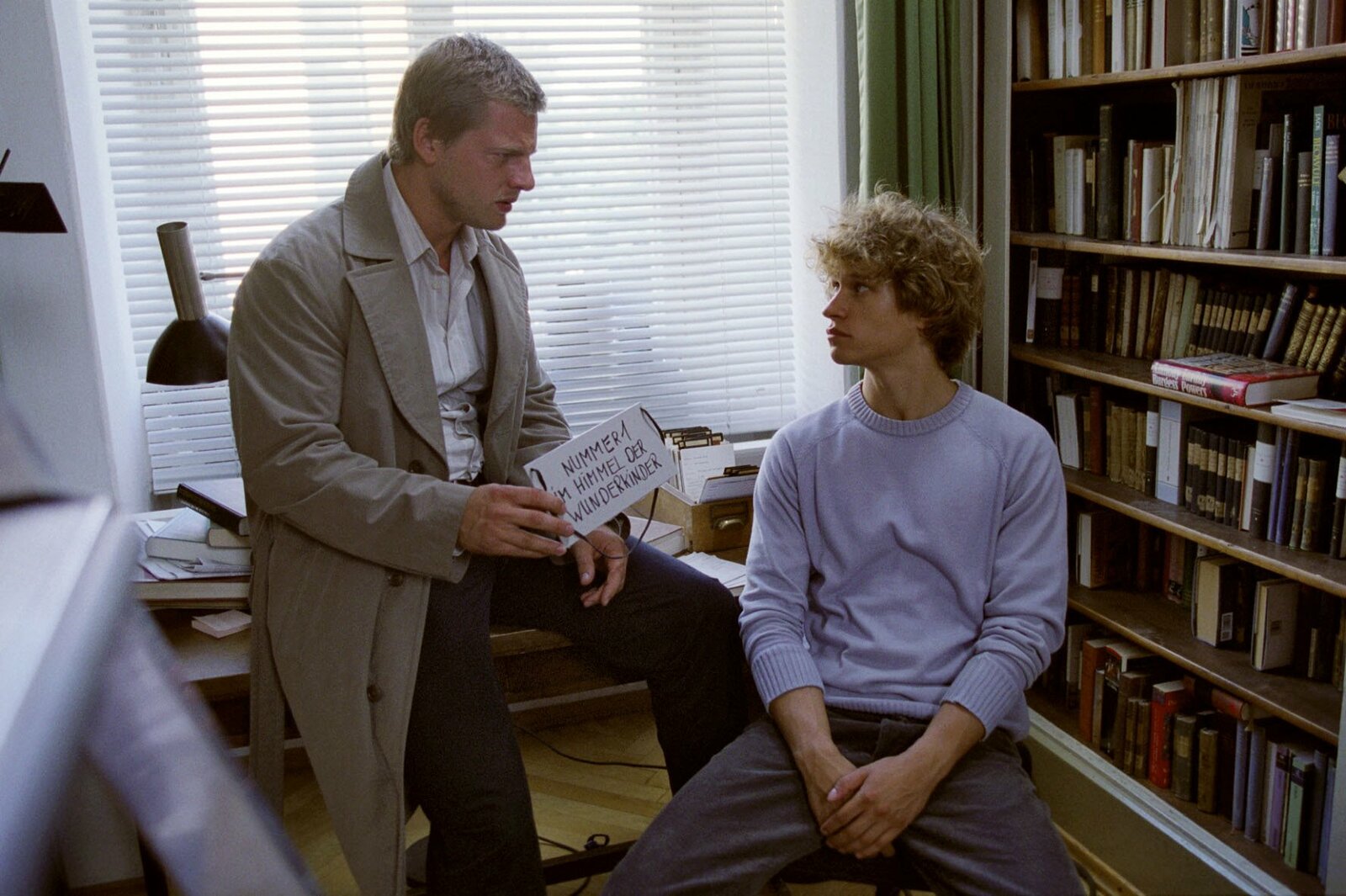 WunderkinderLeo (Henning Baum, l.) zeigt dem reichlich arroganten Daniel Aderhold (Vinzenz Kiefer, r.) das Schild, das der tote Jan-Henrik um den Hals hängen hatte, als er aufgefunden wurde. Kann und wird der Kommilitone der Kripo weiterhelfen?Bild: © ATV2