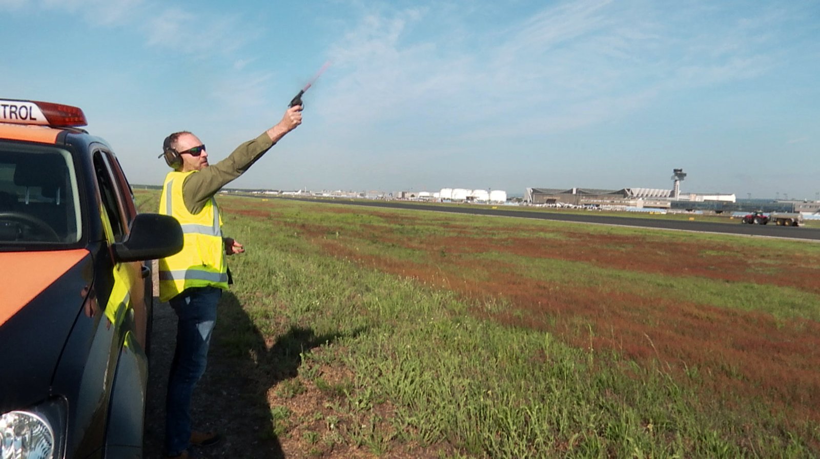 Cockpit im Keller - Rocco Rötger baut spektakulären FlugsimulatorDer Wildlife-Controller Jens Kreuziger beobachtet Vögel, verjagt sie und warnt den Tower. Er kümmert sich auch um Füchse, Hasen, Mäuse auf dem Vorfeld und um die Wälder rundum den Flughafen. Neben einer Schreckschusswaffe zählt auch die Autohupe zu seinen wichtigsten Arbeitsutensilien.Bild: © HR