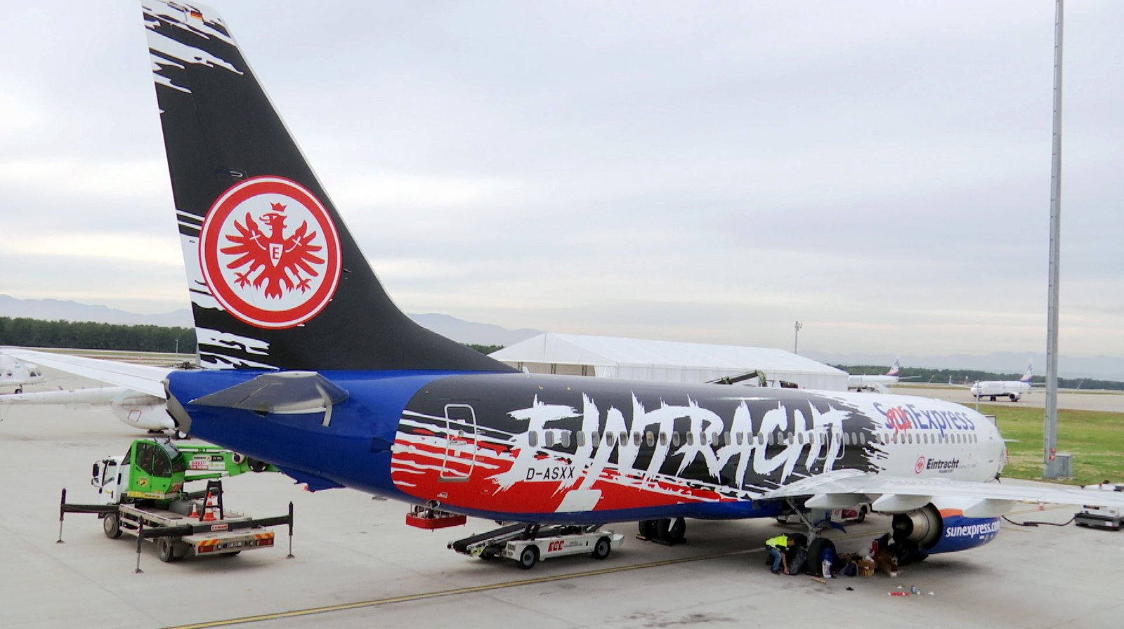 Der neue Eintracht-Flieger am FlughafenDer neuen Eintracht-Flieger: Die in den Farben des Fußballbundesligavereins „Eintracht Frankfurt“ fertig beklebte Boeing 737-800.Bild: © HR