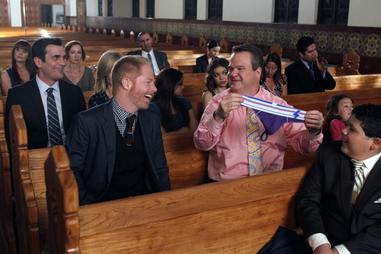 SuperPartyBabyBowlL-R: Mitchell Pritchett (Jesse Tyler Ferguson), Gloria Delgado-Pritchett (Sofía Vergara), Jay Pritchett (Ed O'Neill) and Cameron Tucker (Eric Stonestreet)Bild: © Comedy Central