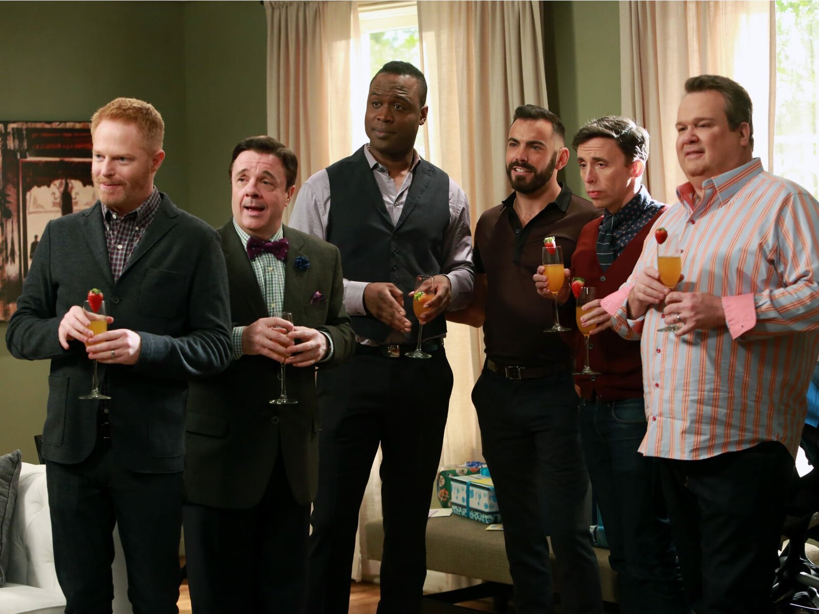 Wenn Schwestern lästern am ValentinstagV.l.: Mitchell (Jesse Tyler Ferguson), Pepper (Nathan Lane), Longinus (Kevin Daniels), Jotham (Matthew Ritsch), John-John (Kevin Cahoon), Cameron (Eric Stonstreet)Bild: © ViacomCBS