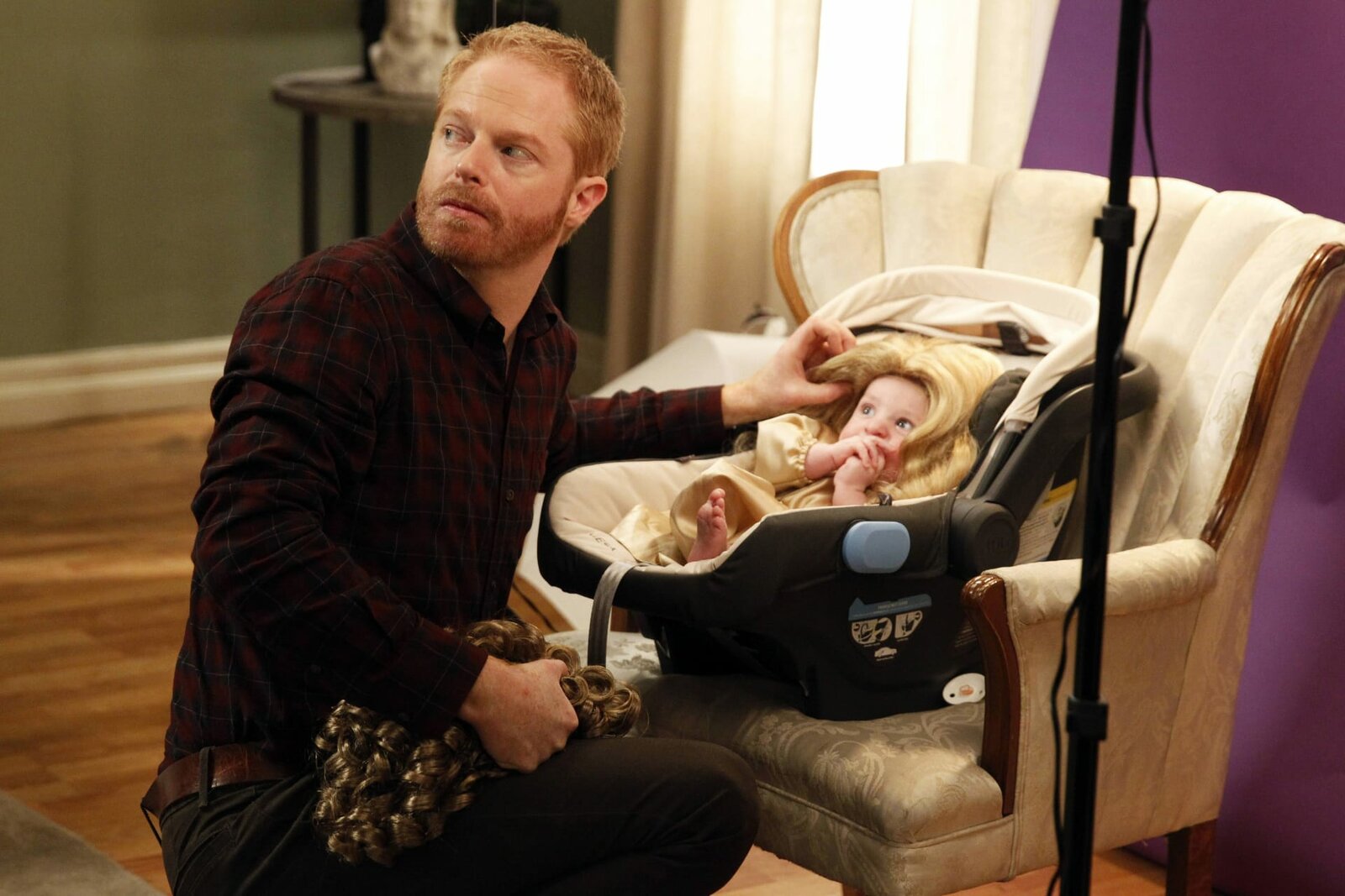 HaarspaltereienEntsetzt stellt Mitchell (Jesse Tyler Ferguson) fest, dass Lily auf dem Kopf von Baby Joe eine Perücke mit Sekundenkleber festgeklebt hat.Bild: © ViacomCBS / Hopper Stone