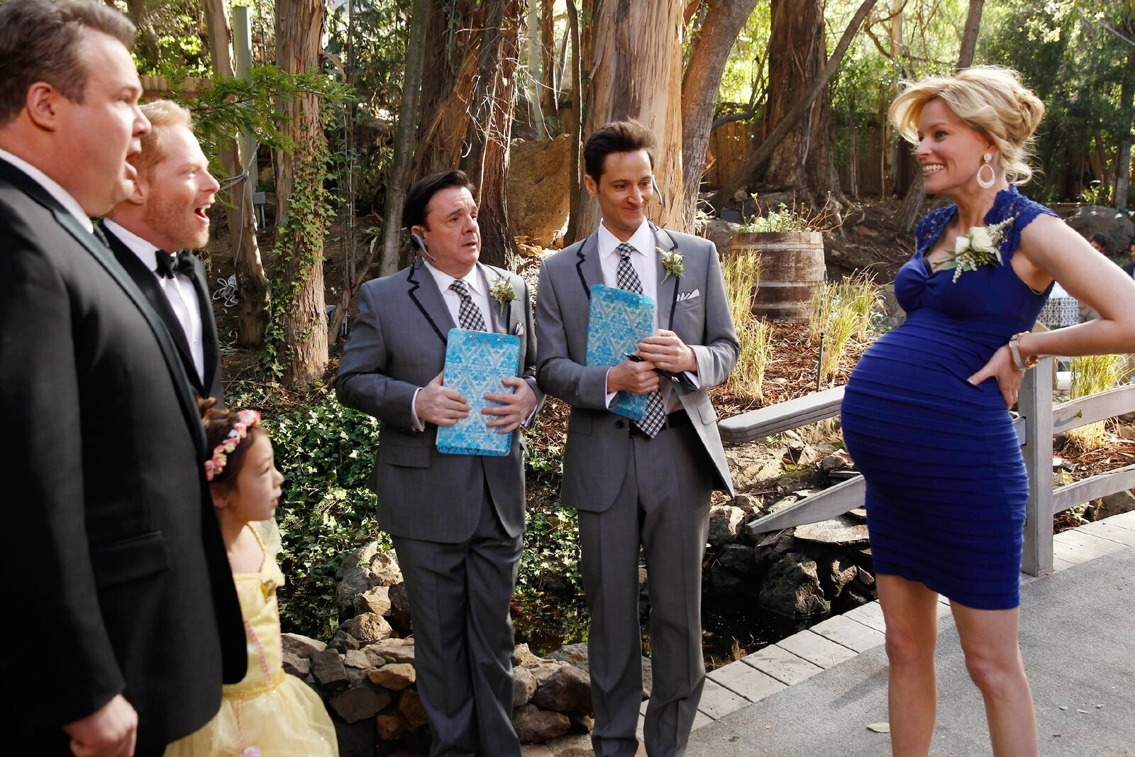 Hochzeit auf Hochtouren (Teil 2)V.l.: Cameron Tucker (Eric Stonestreet), Mitchell Pritchett (Jesse Tyler Ferguson), Lily Tucker-Pritchett (Aubrey Anderson-Emmons), Pepper Saltzman (Nathan Lane), Ronaldo (Christian Barillas), Sal (Elizabeth Banks)Bild: © RTL NITRO / 20th Century Fox Television