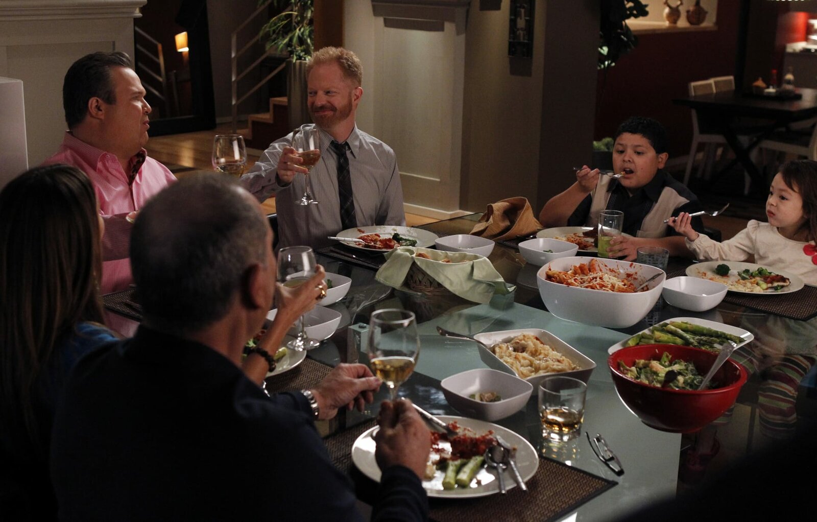 Ich? Eifersüchtig?v.li.: Gloria Delgado (Sofía Vergara), Cameron Tucker (Eric Stonestreet), Jay Pritchett (Ed O'Neill), Mitchell Pritchett (Jesse Tyler Ferguson), Manny Delgado (Rico Rodriguez), Lily Tucker-Pritchett (Aubrey Anderson-Emmons).Bild: © ViacomCBS / Hopper Stone