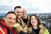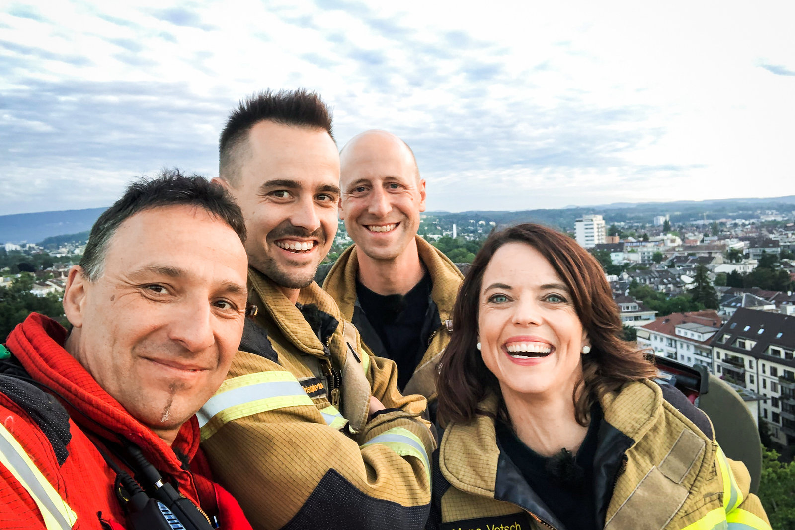 Mona mittendrin bei der BerufsfeuerwehrMona mittendrin bei der Berufsfeuerwehr Staffel 4 Herbst 2019 Folge 1 Mona Vetsch (r.) hoch über Basel auf dem 45 Meter hohen Hubkran der Berufsfeuerwehr mit Leutnant Thomas Nyffeler (l.), Feuerwehrmann Christopher Humphries (2.v.l.) und Feuerwehrmann Patrick Sumi (2.v.r.) SRFBild: © SRF1