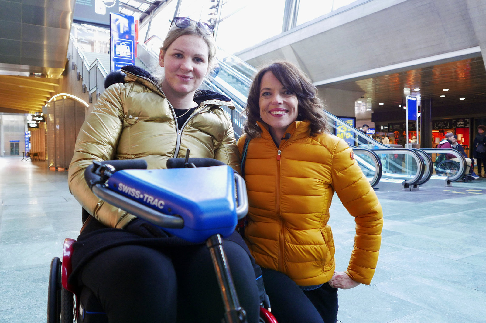 Mona mittendrin bei den ParaplegikernMona mittendrin bei den Paraplegikern Mona Vetsch mit Melanie Hürlimann und Jürg Rusch unterwegs im Bahnhof Luzern beim Stadttraining. 2019 SRFBild: © SRF1