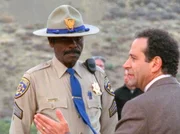 Mr. Monk steckt im StauMonk (Tony Shalhoub, r.) steckt wegen einem Unfall im Stau fest. Als er sich das Unfallauto anschauen geht, fallen Monk sofort Ungereimtheiten auf, die auf ein Verbrechen statt auf einen Unfall hinweisen. Doch der Verkehrspolizist Sgt. Parnell (Steven Williams) will davon nichts wissen.Bild: © Super RTL