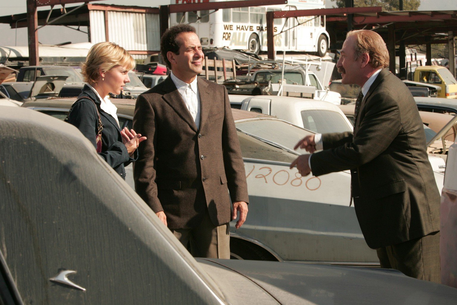 Mr. Monk und das Geheimnis einer EheUm herauszufinden, ob seine Frau Karen tatsächlich eine Affäre mit Cop Ryan Sharkey hat, beauftragt Captain Leland Stottlemeyer (Ted Levine, r.) Monk (Tony Shalhoub, M.) im Beisein von seiner Assistentin (Traylor Howard), diesen zu beschatten.Bild: © ProSieben Media AG © Universal Pictures