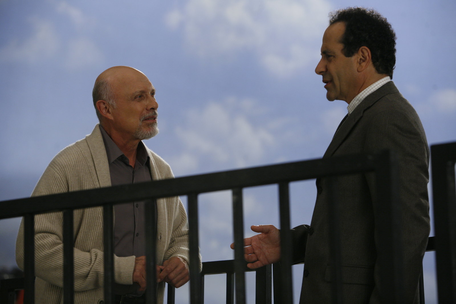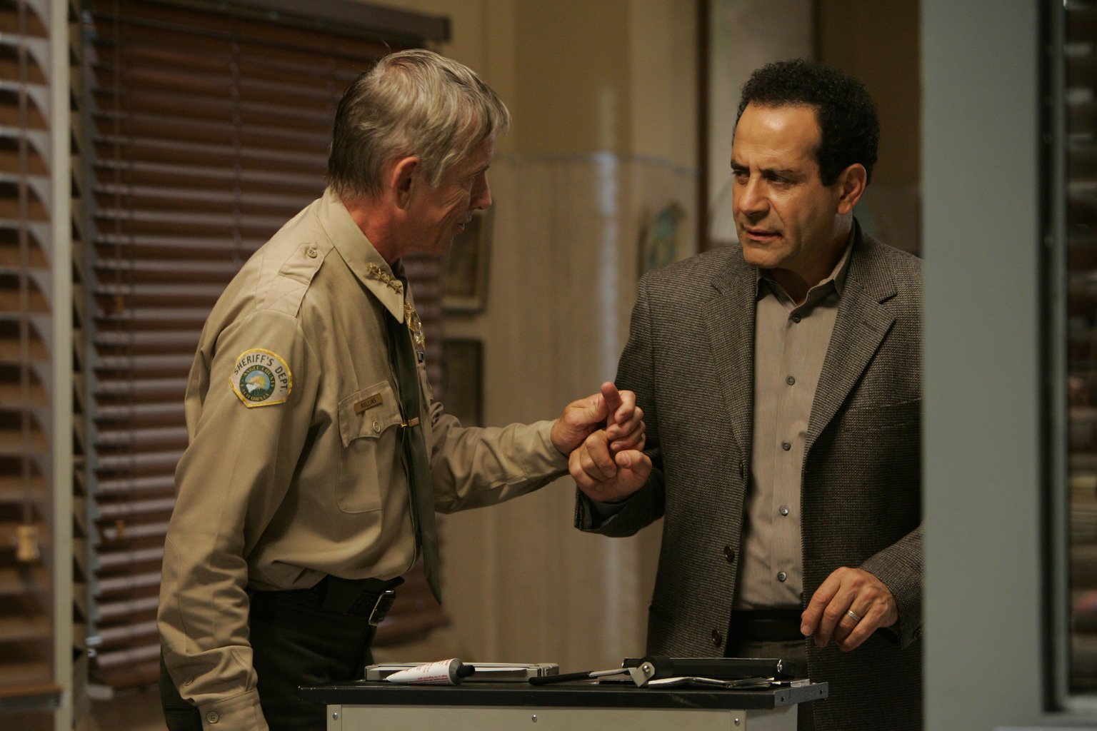 Mr. Monk wird gejagt (1)Adrian Monk (Tony Shalhoub, r.) versucht Sheriff Rollins (Scott Glenn, l.) glaubhaft zu vermitteln, dass er unschuldig ist und jemand anders den Mörder seiner Frau getötet hat ...Bild: © ProSieben Media AG © USA Network
