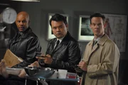 Mr. Monk und der echt total tote TypLt. Randall Disher (Jason Gray-Stanford, r.) soll das FBI in Gestalt von Agent Thorpe (Chris Williams, l.) und Agent Keao (Peter James Smith, M.) unterstützen.Bild: © ProSieben Media AG © Universal Pictures