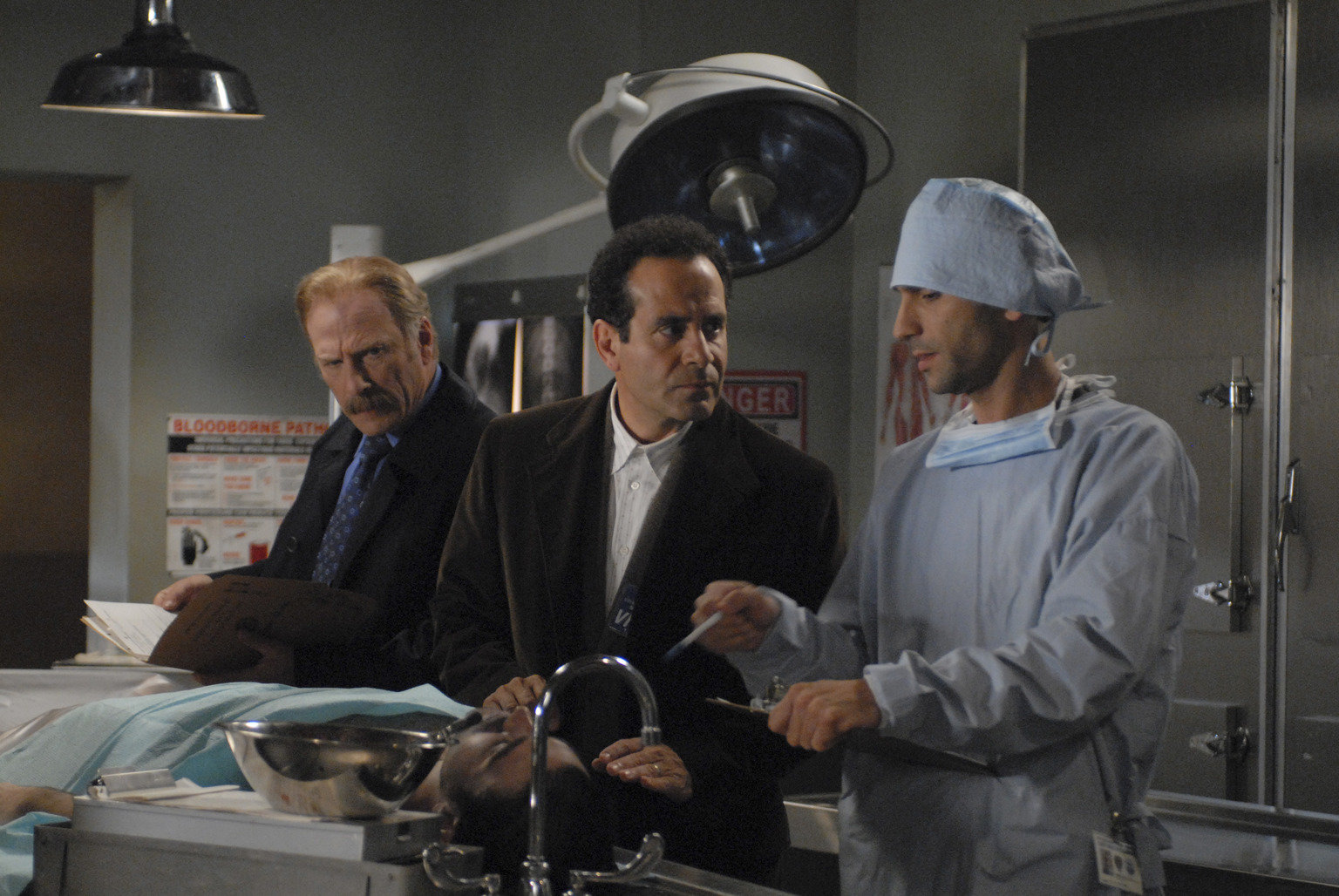 Mr. Monk und der echt total tote TypDer ärztliche Leichenbeschauer (Andrew Rothenberg, r.) erklärt Captain Leland Stottlemeyer (Ted Levine, l.) und Adrian Monk (Tony Shalhoub, r.) wie das Opfer vermutlich zu Tode gekommen ist.Bild: © ProSieben Media AG © Universal Pictures