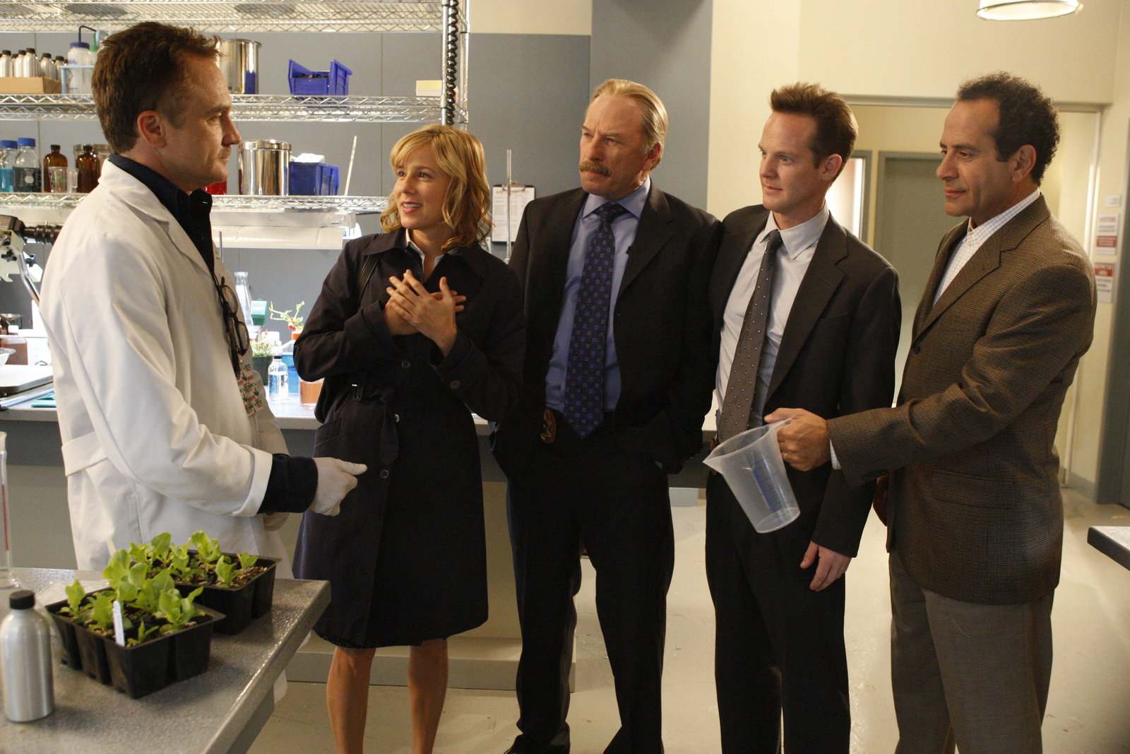 Mr. Monk schießt auf den WeihnachtsmannPictured: (l-r) Dean Berry (Bradley Whitford), Natalie Teeger (Traylor Howard), Capt. Leland Stottlemeyer (Ted Levine), Lt. Randall Disher (Jason Gray-Stanford), Adrian Monk (Tony Shalhoub)Bild: © ATV2