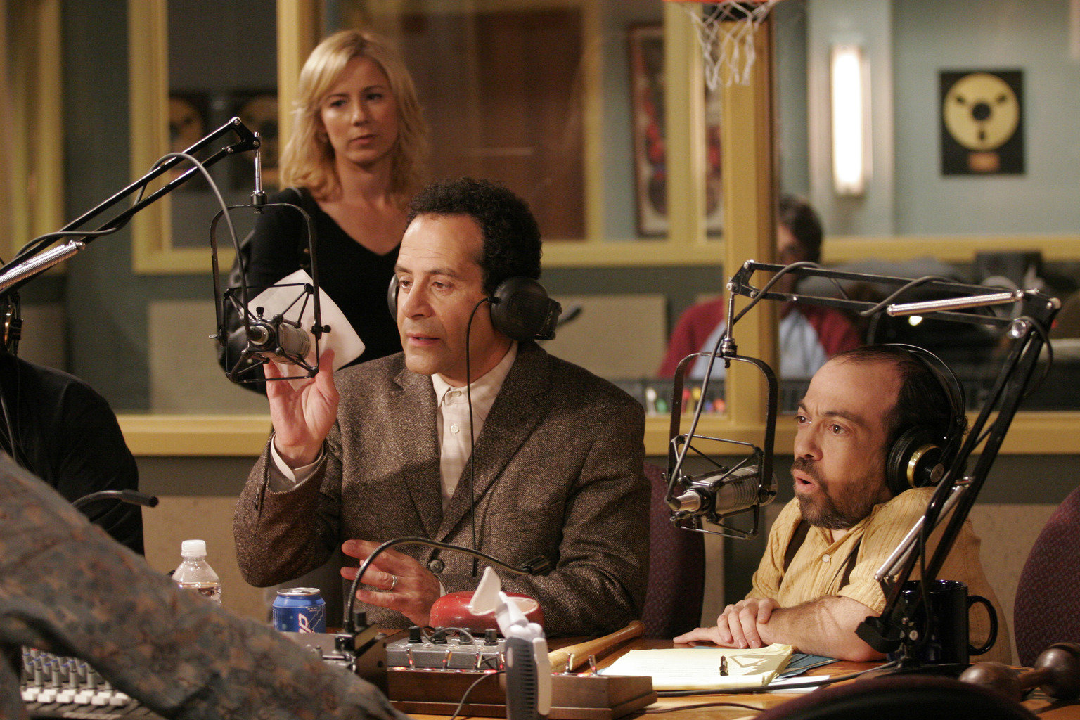 Mr. Monk ist auf SendungMonk (Tony Shalhoub, M.) soll in der Radiosendung bei Little Willie Karelli (Danny Woodburn, r.) sprechen. Natalie Teeger (Traylor Howard, l.) begleitet ihn zu diesem wichtigen Termin.Bild: © ProSieben Media AG © Universal Pictures